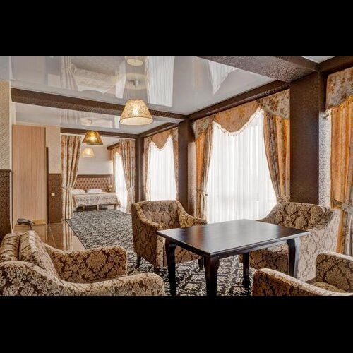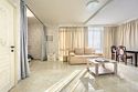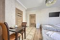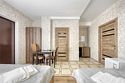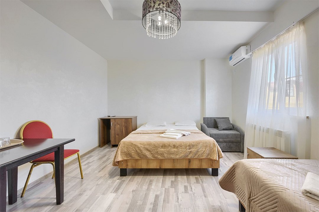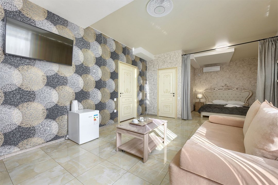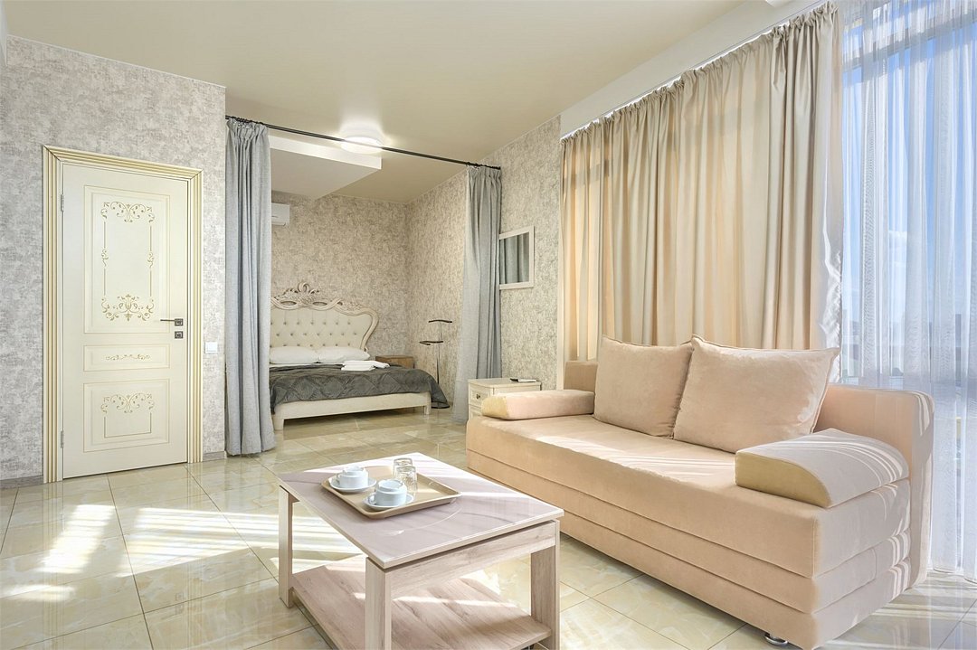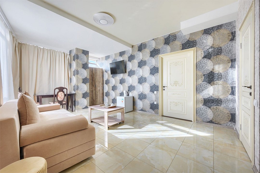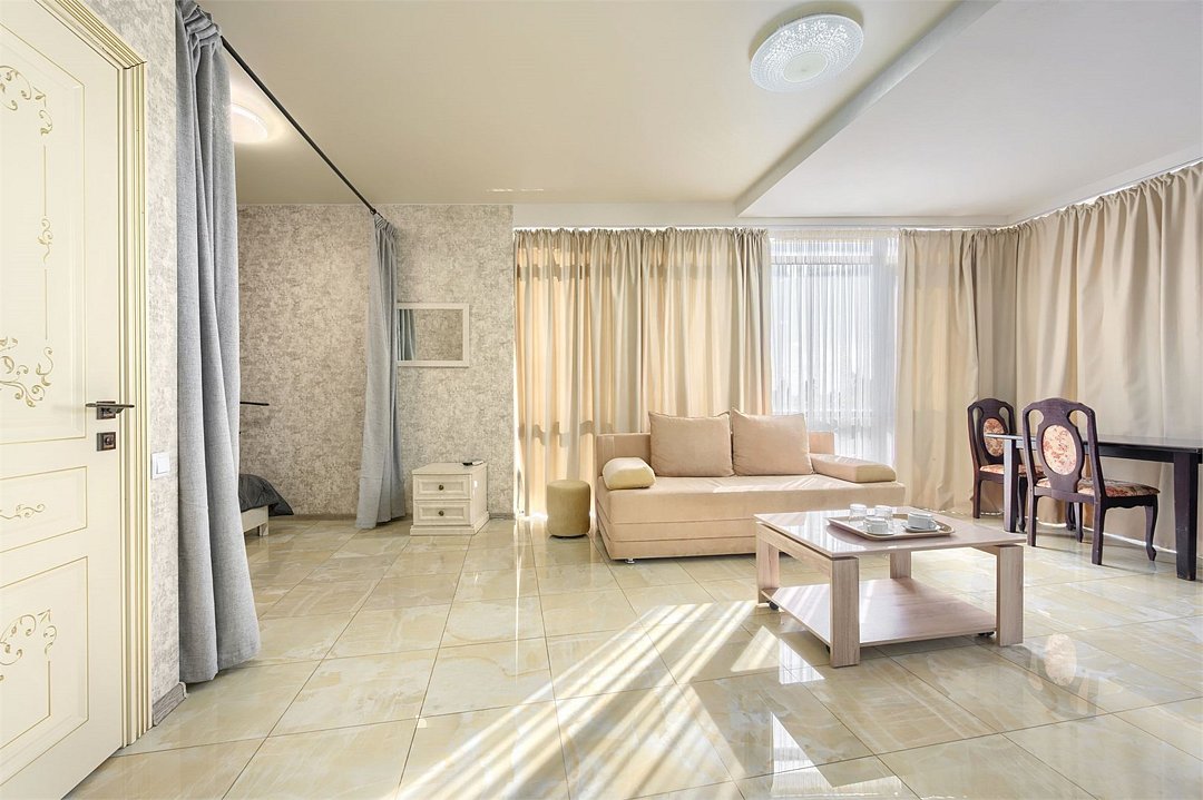 Стильный и просторный номер с современным дизайном, сочетающим изысканность и комфорт. Пастельные тона и элегантные элементы декора создают уютную атмосферу. Полностью оборудованная зона отдыха с мягким диваном и обеденным столом идеально подойдет для спокойного отдыха. Спальная зона отделена шторой, обеспечивающей приватность. Идеален для гостей, ценящих стиль и удобство.Услуги и удобства