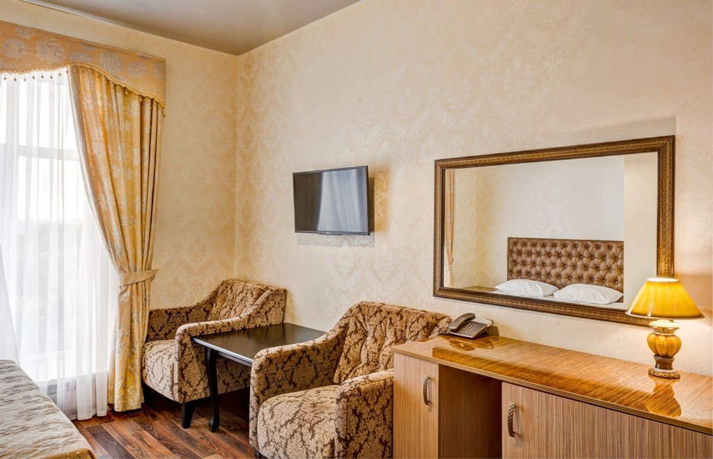 телевизор, кабельное телевидение, Wi-Fi, интернет, телефон, холодильник, кондиционер, светильник, настольные лампы, ванная комната, санузел, банные полотенца, тапочки, гигиенические средства, две односпальные кровати, кресла, тумбы, шкаф для одежды, гардеробная, вешалки, журнальный столик, письменный стол, обеденный стол, зеркало, пуфики, ковер, набор посуды, унитаз, раковина, косметическое зеркало, гостиная зона, ковровое покрытие, отопление, душ, вид на город, кулер на этаже, плиточное покрытие, креслоВ гостиничном номере