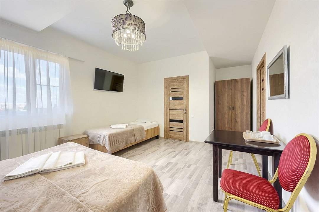 Комфорт TWIN номер — любимчик среди гостей нашего отеля. Интерьер оформлен в теплых тонах, что создает особенную расслабляющую атмосферу, будто вы нежитесь на солнышке, даже не выходя из дома. Уютный дизайн и современное оснащение номера (беспроводной интернет, мини-холодильник телевизор с плоским экраном) — здесь есть все для вашего комфорта.Услуги и удобства