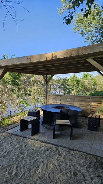 Под навесом уютно размещен гриль-стол с шестью стульями, который создает идеальные условия для дружеских встреч на свежем воздухе. Стол совмещает в себе жаровню и удобную столешницу, и вся компания может наслаждаться общением, не отвлекаясь от процесса приготовления.