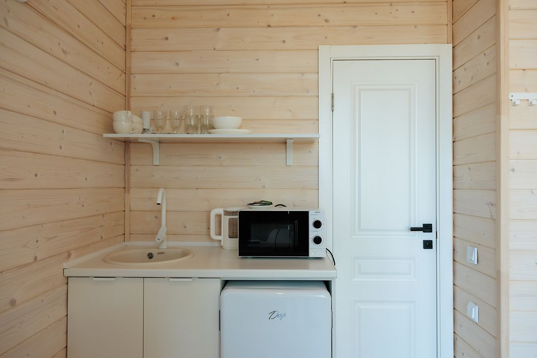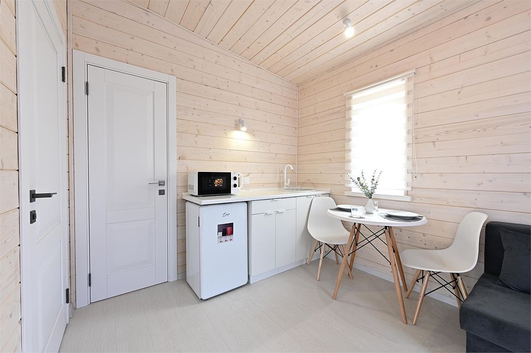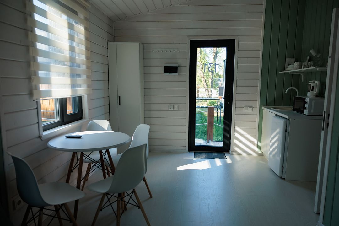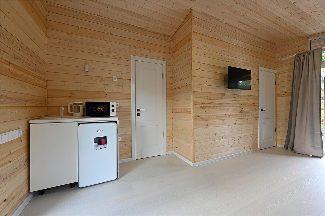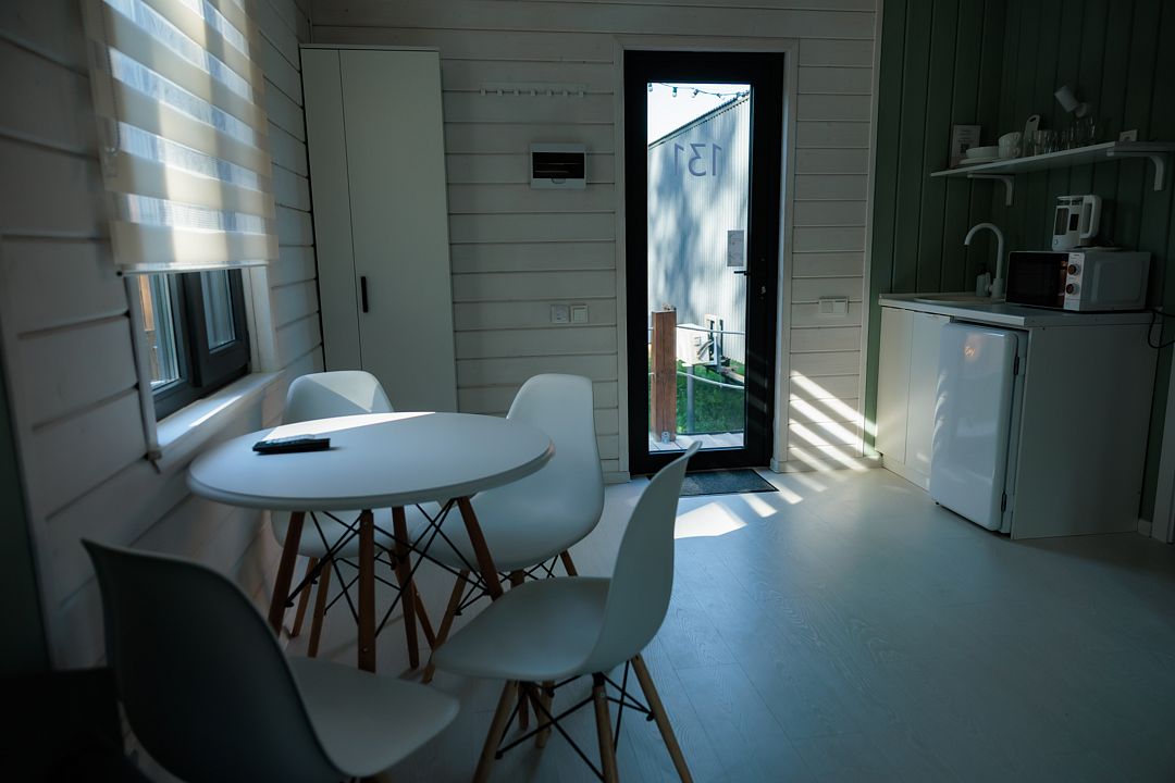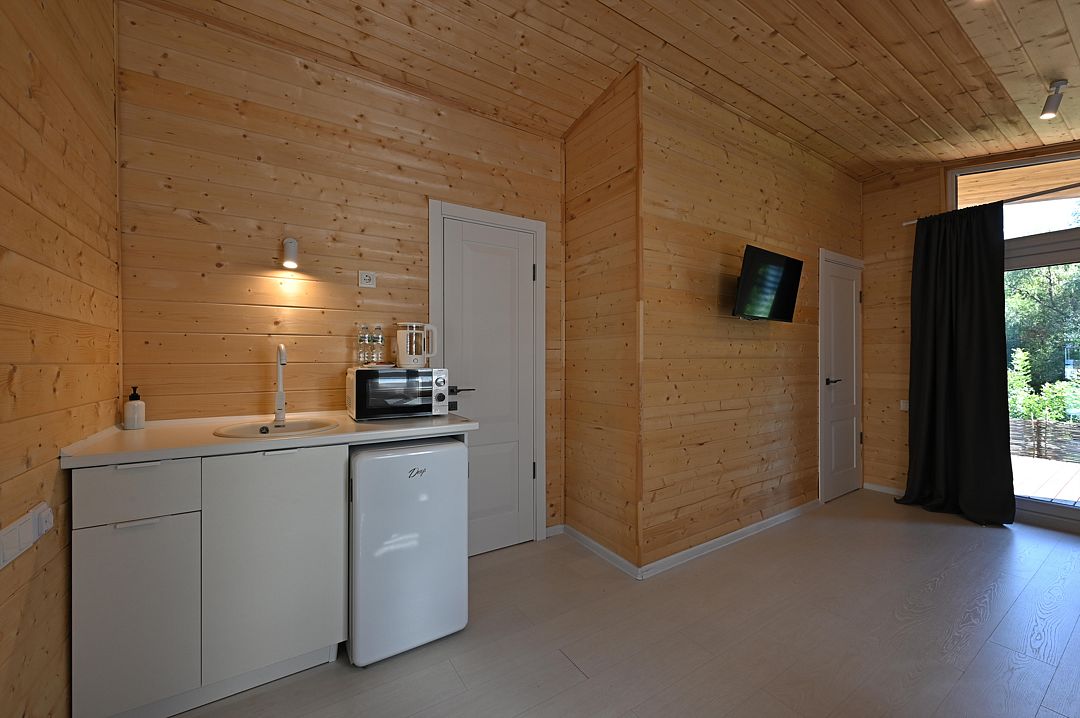 НедостаткиТонкие стены в домике, совместные с другими постояльцами, отсутствие холодильника