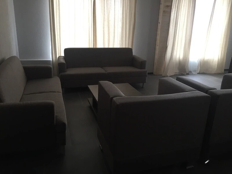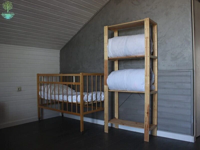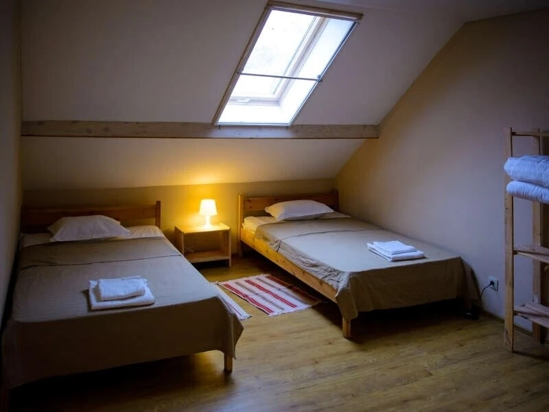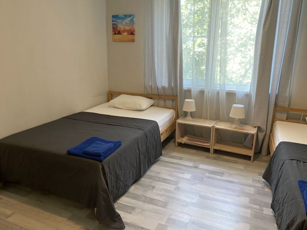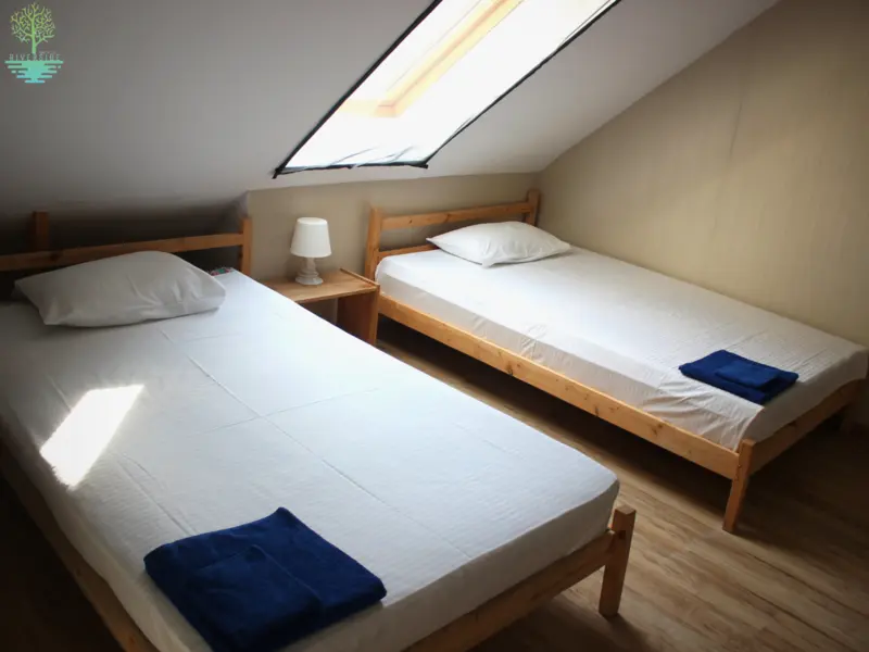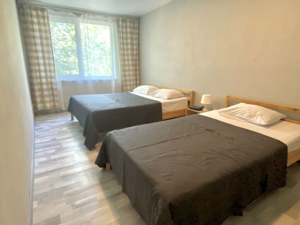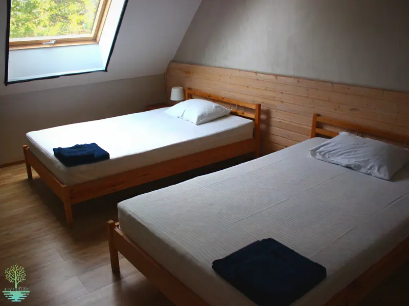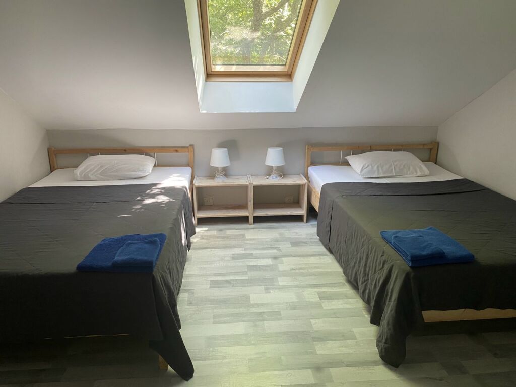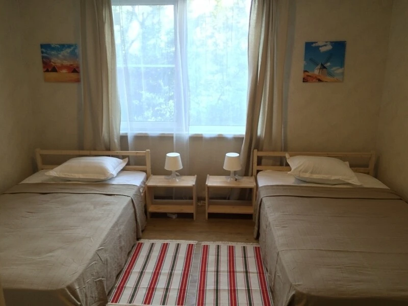 - 2 спальни: 1 кровать 160см и 2 кровати 120см, тумбочки, стеллажи, душ/туалет.