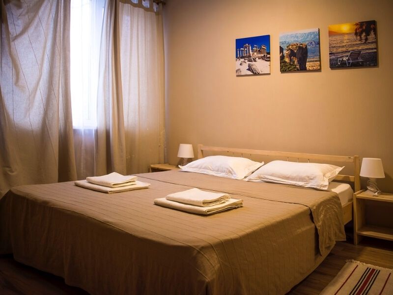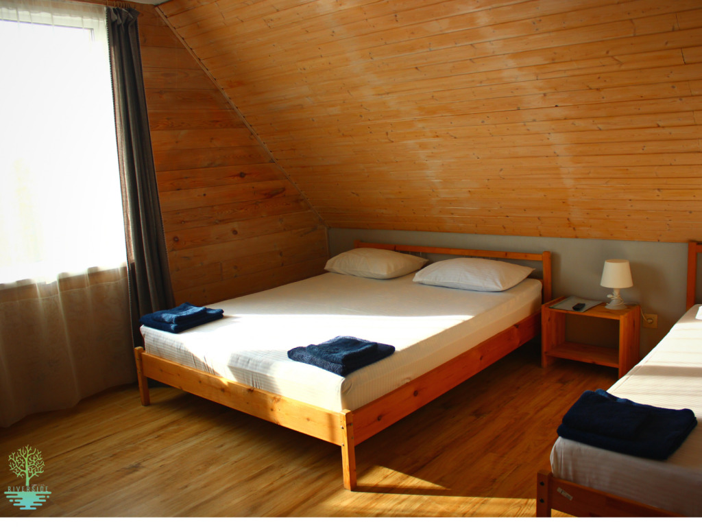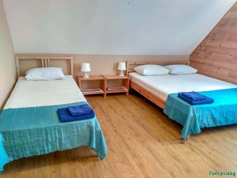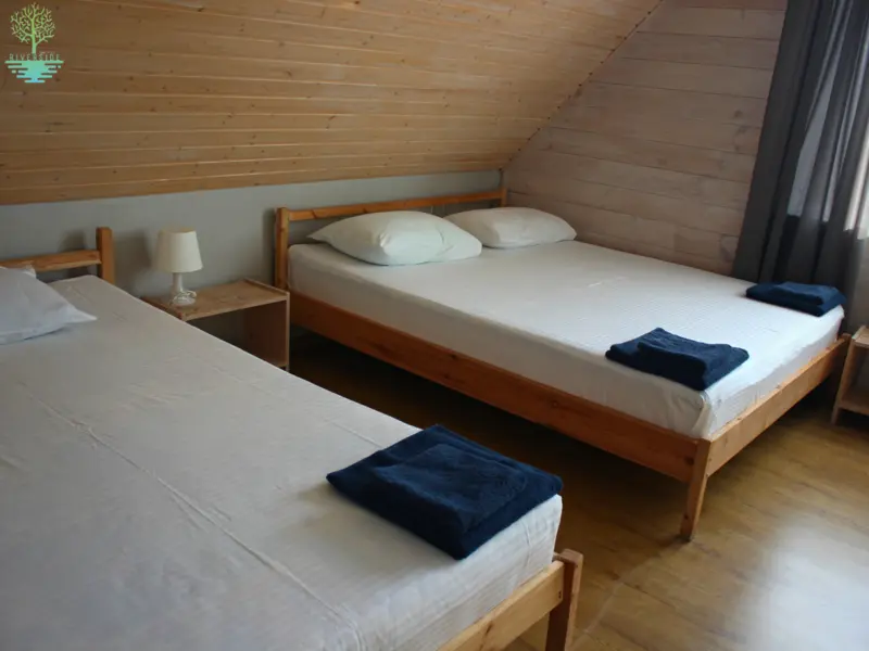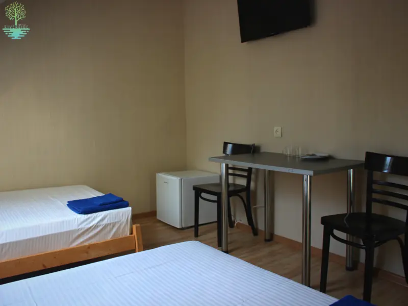 Две широкие кровати - двуспальная и односпальная, а также спокойный дизайн номера помогут забыть о городском шуме и суете и полноценно отдохнуть.