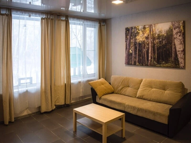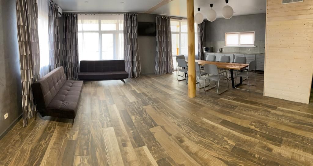 - Гостиная зона 45м2: диван, ТВ, журнальный столик, панорамные окна с видом на дубовый лес и Дон.