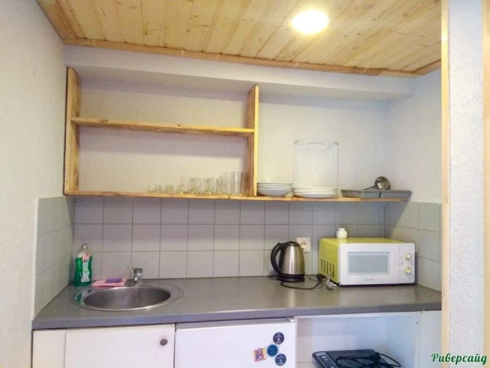 - Кухонная зона: кухня, стол, стулья, СВЧ, мойка, холодильник, чайник, посуда.