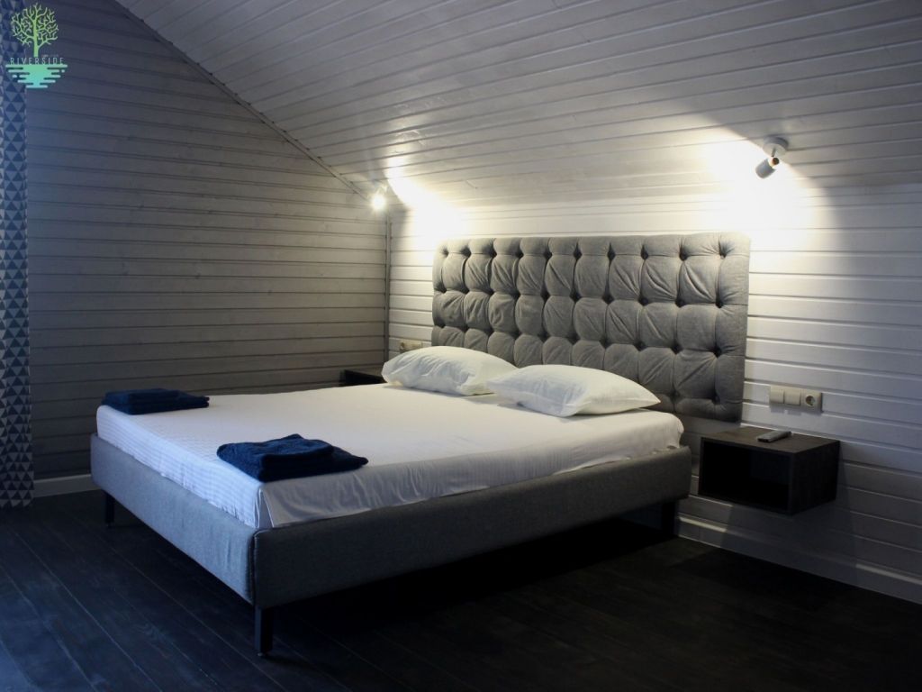Двухэтажный VIP-коттедж находится в дубовом лесу. Коттедж выполнен в благородных серых тонах в духе Скандинавии и состоит из 6 комнат: 5 спален, комната отдыха, гостиная, террасы, 6 санузлов.