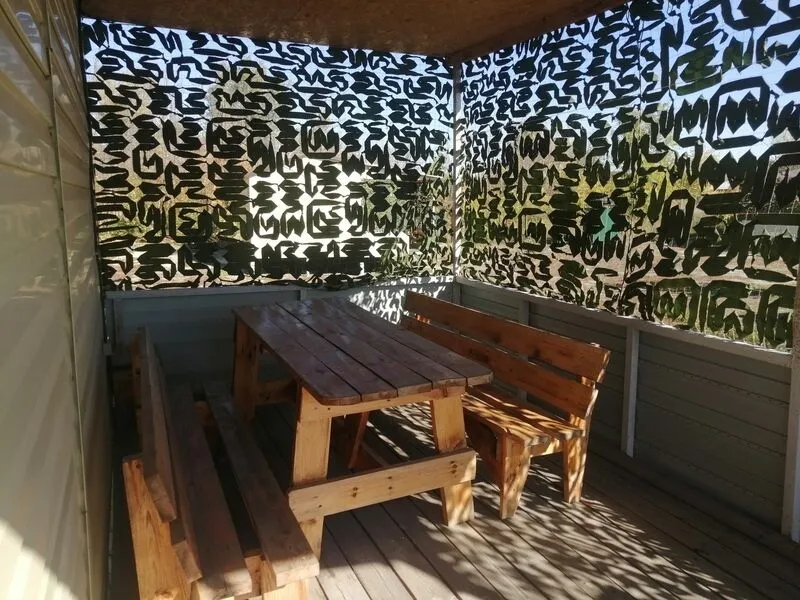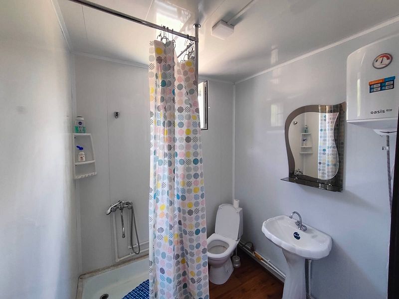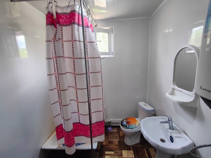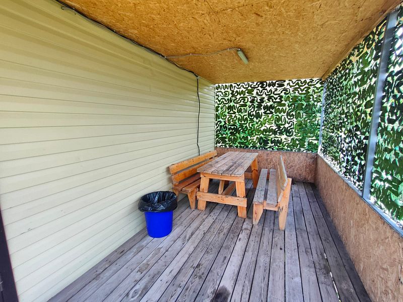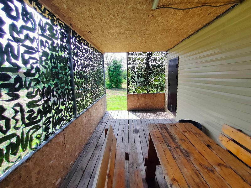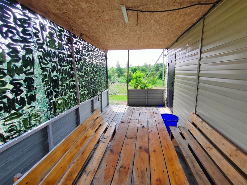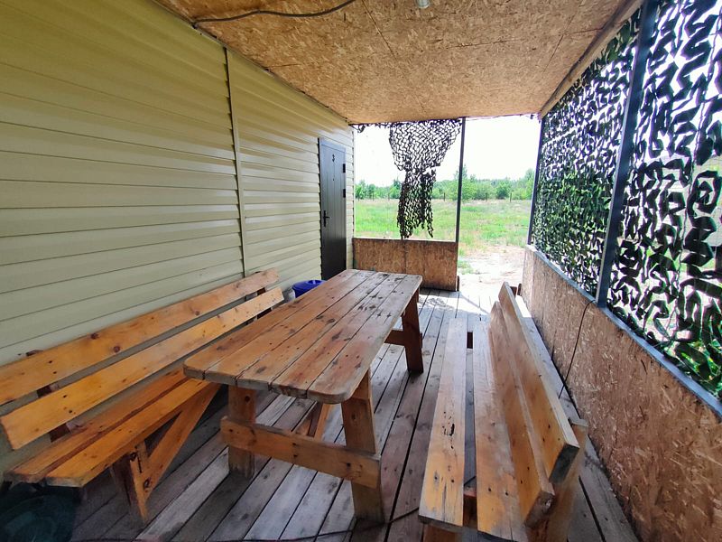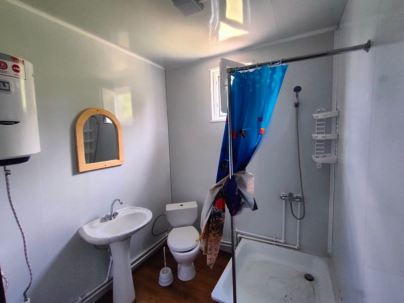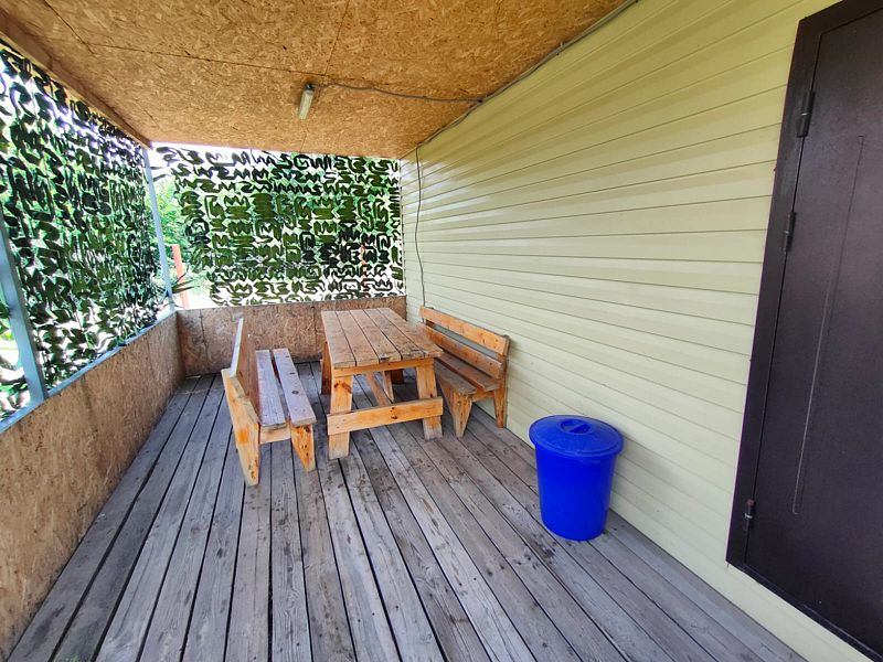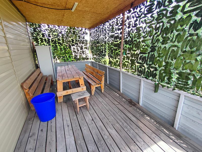 В доме: веранда с большим столом и двумя лавочками, сплит-система, обогреватель, холодильник, микроволновка, эл. плита, комплект посуды на 4х персон, стол с 4мя стульями, душ, туалет, раковина, гор./хол. вода.