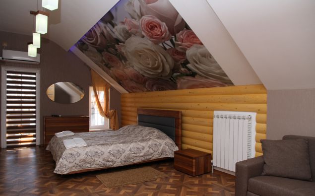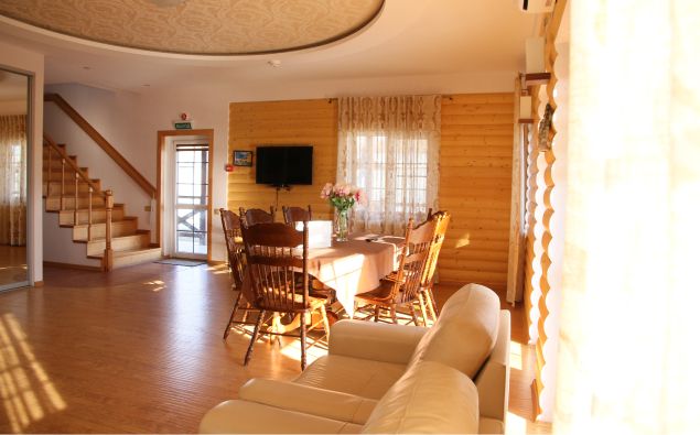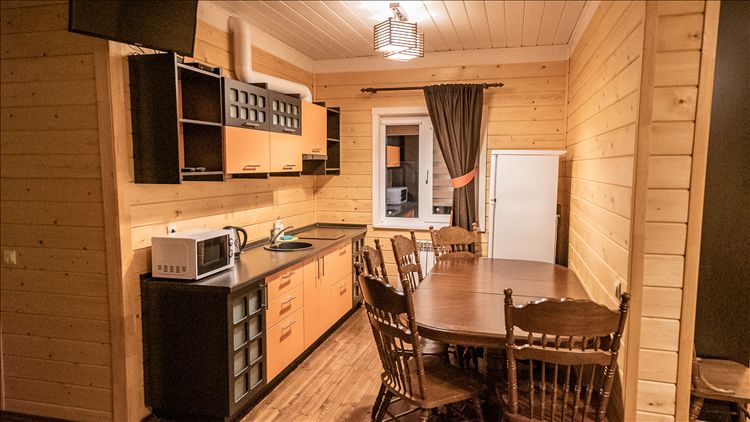 4 двухэтажных коттеджа-сруба. 1 этаж: просторный холл с кожаным диваном (2 взрослых места), кухня (большой холодильник, эл.плита, микроволновая печь, комплект посуды на 8 персон), ванная комната. 2 этаж: две спальни с двуспальными кроватями (в одной из них есть диванчик на 2 детских места); к каждой комнате примыкает ванная с душевой кабиной.
