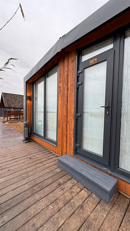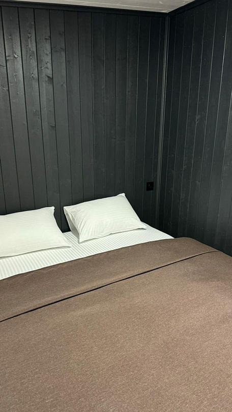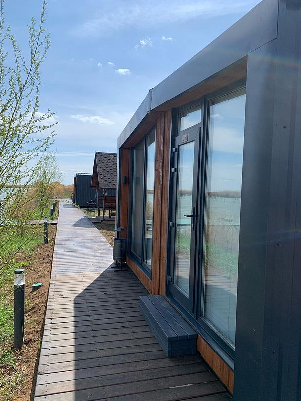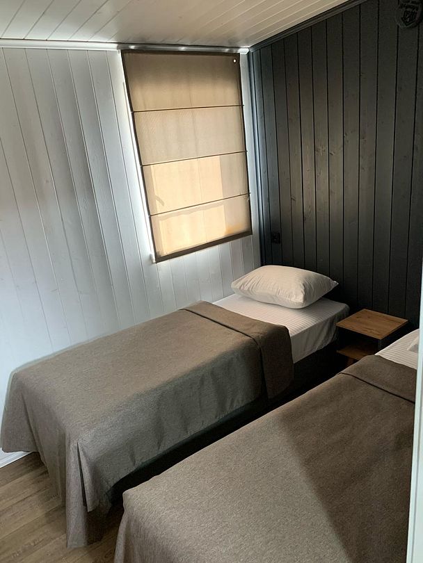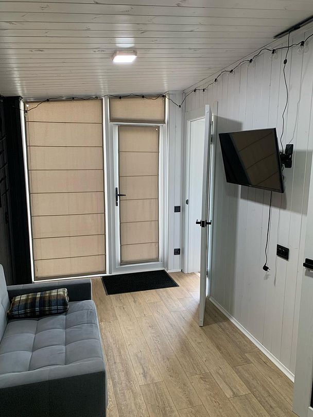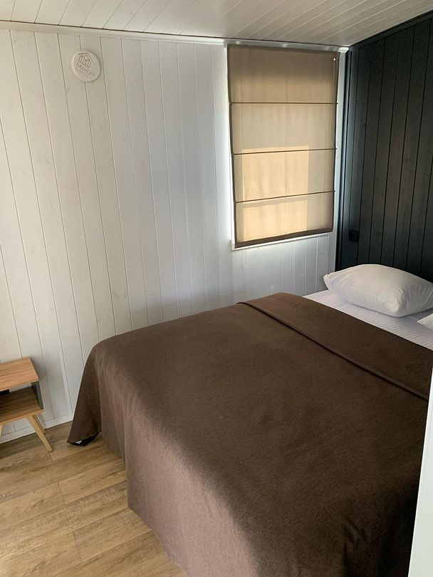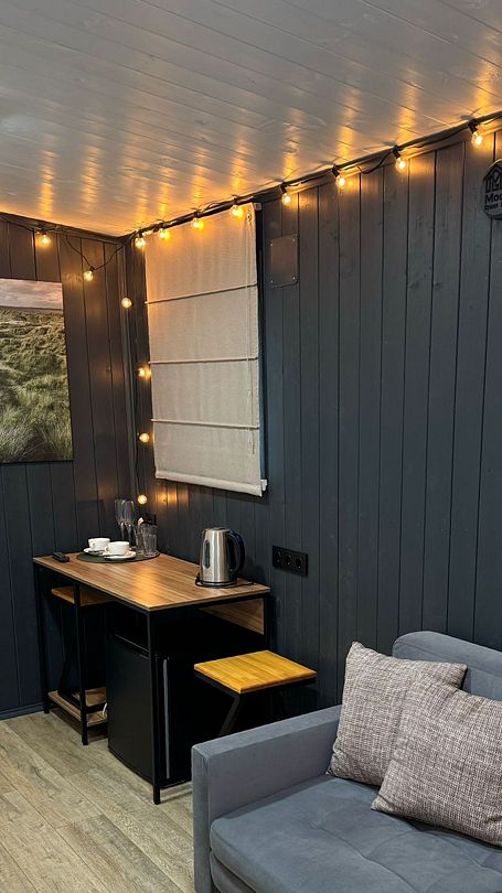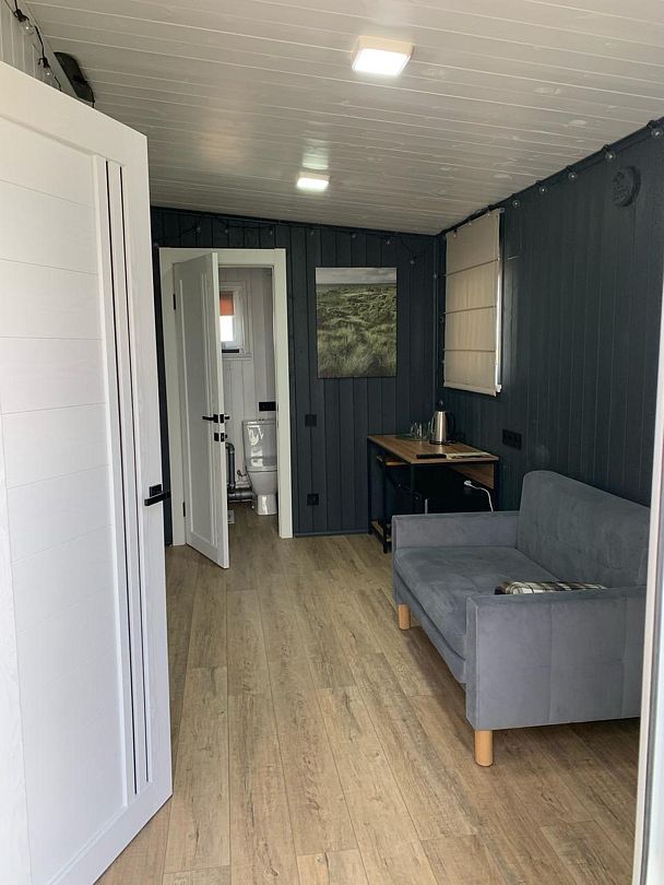Гостям предлагается расположиться в просторном комфортабельном доме или в небольшом модульном домике на двоих. В большом доме подготовлено пять спален, каждая из которых оснащена набором мягкой мебели, телевизором и собственной ванной комнатой. Имеется Wi-Fi, поэтому даже за городом вы будете на связи. Вечер можно провести в гостиной у камина или поиграть в бильярдном зале. Домик на двоих же оснащен одной спальней, санузлом и мини-холодильником.