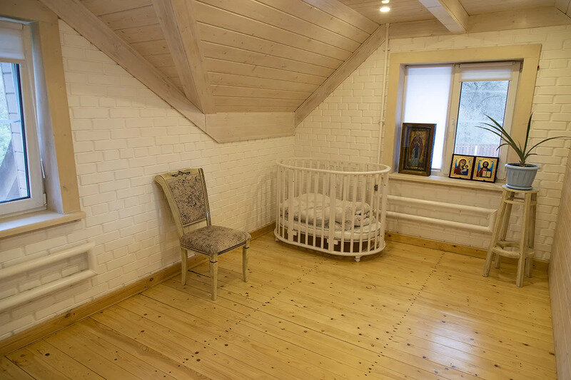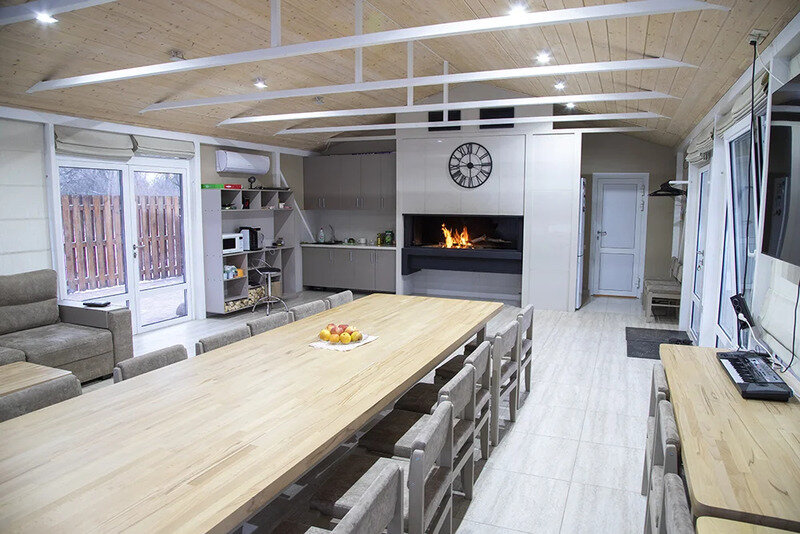 На красивой благоустроенной территории есть беседка с кухней, магнал-камином и банкетным залом для большой компании, детская площадка, баня с бассейном, бесплатная парковка и озеро неподалёку.