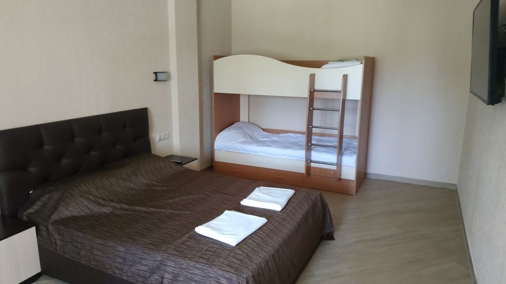 Номер состоит из двух комнат: спальни для отдыха и гостиной с телевизорами и кондиционерами в каждой из них. Для отдыха родителей предлагается комфортабельная двуспальная кровать с ортопедическим матрасом — с прикроватными тумбочками, настенными светильниками и группой электрических розеток для подзарядки смартфонов и другой электроники с каждой из сторон. Для детей предусмотрена двухъярусная кровать, которая так нравится и малышам, и подросткам.