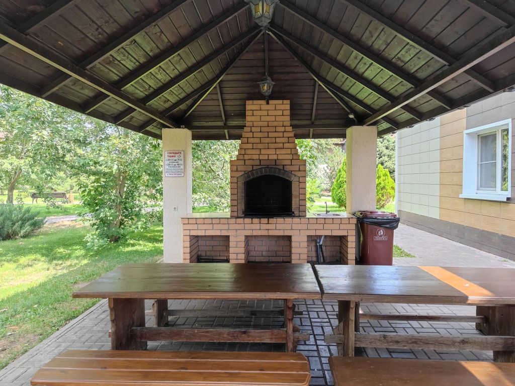 Также к вашим услугам большая мангальная площадка, рассчитанная на 70 - 80 гостей. Крытая, с освещением, с печью для барбекю, а также удобной рабочей панелью, где можно помыть зелень и фрукты, нарезать хлеб и овощи, приготовить закуски. Есть возможность подключения звукового оборудования, более чем достаточно места для танцев и проведения конкурсов.