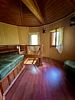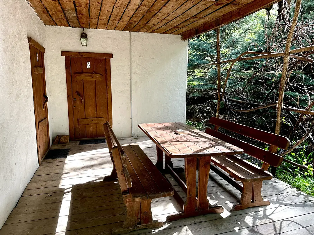 На втором этаже находится спальня с диваном и сплит-системой для поддержания комфортной температуры. На улице имеется навес, под которым расположены столик и лавки.