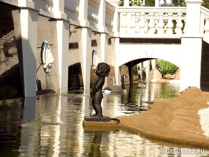 Живописная территория с искусственными реками и аквариумами с живой рыбой, водопадами, фонтанами, мостиками и конечно же величественные сосны.