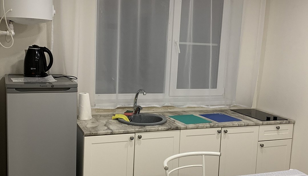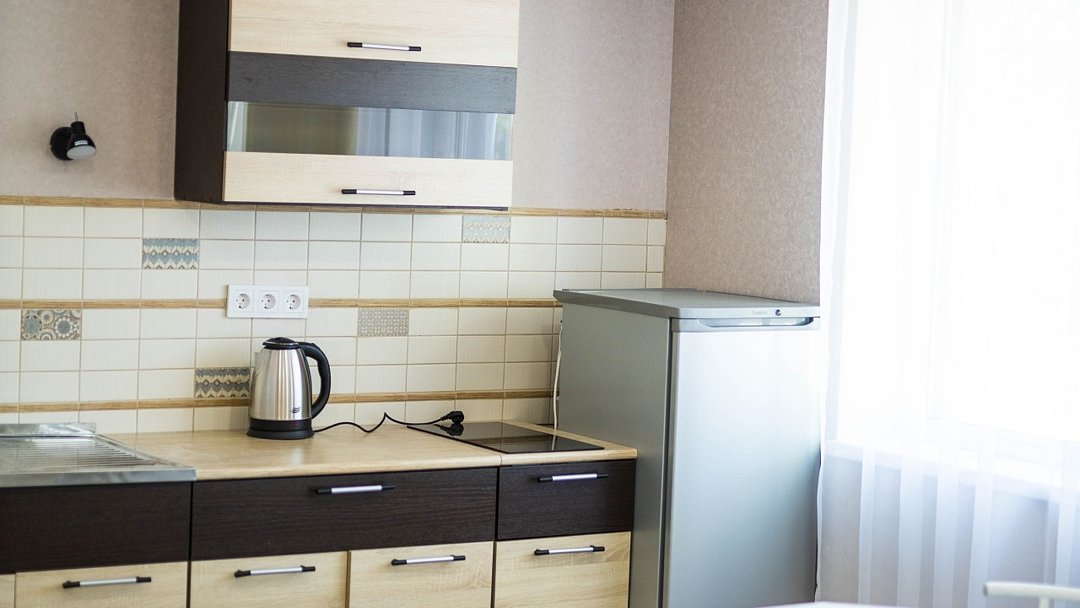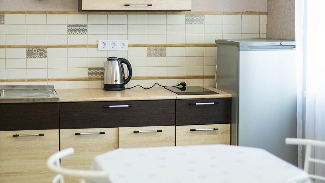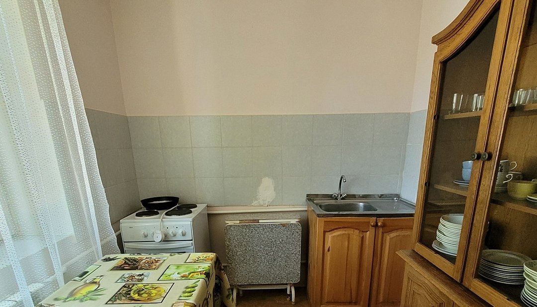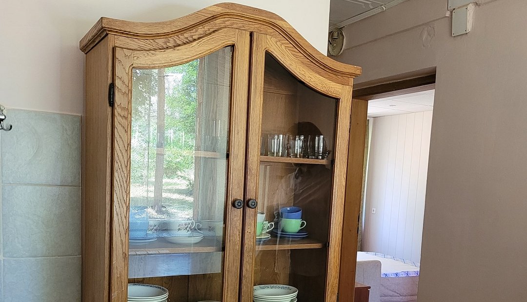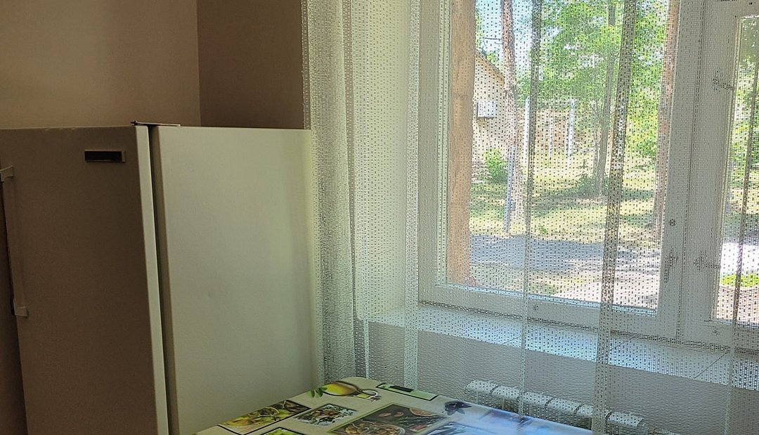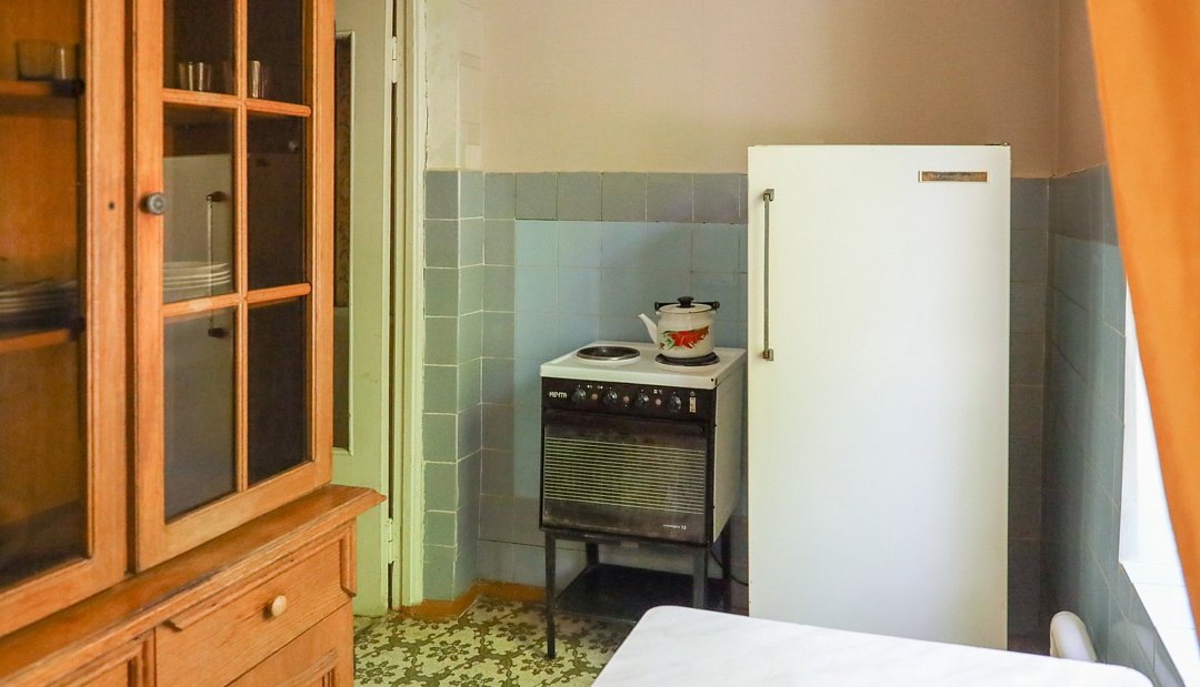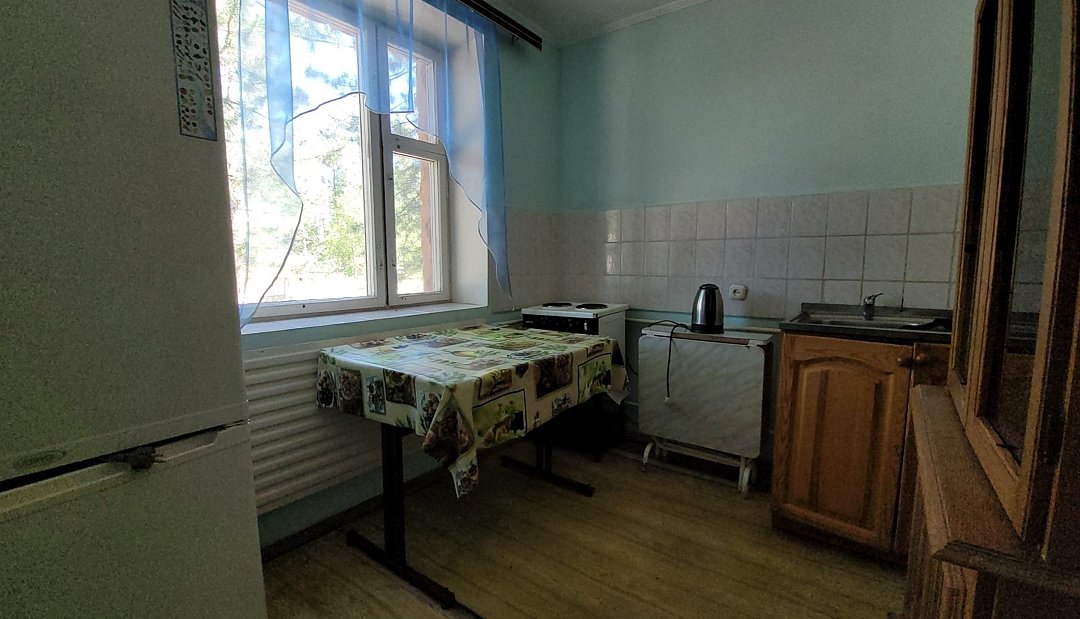 На кухне есть всё для приготовления и приёма пищи: электрическая плита, холодильник, чайник, обеденный стол, стулья, буфет, посуда, столовые приборы на 5-ть персон.