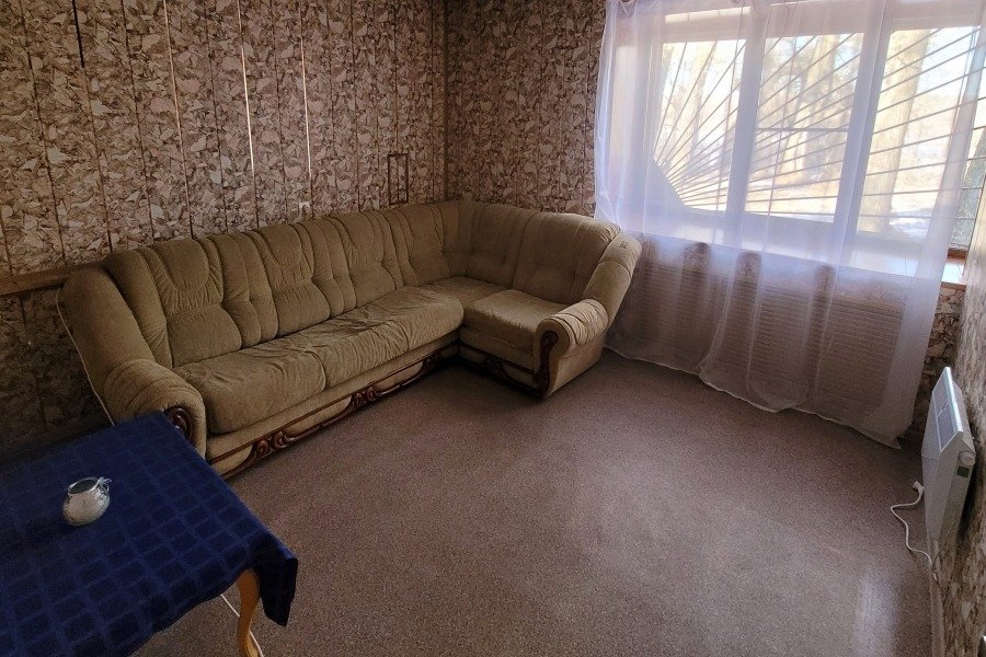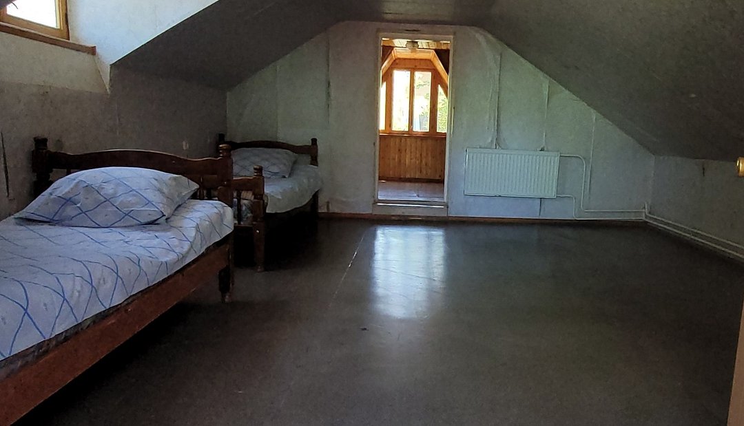 На первом этаже - 5 одноместных кроватей, постельные принадлежности, мягкая мебель и холодильник.
