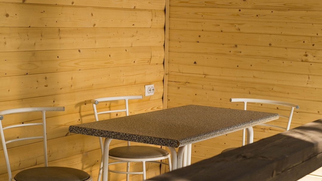 2-х этажный с закрытой верандой на 13 человек. На закрытой веранде - столы и стулья.