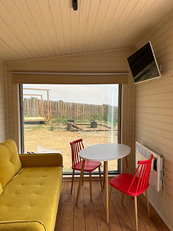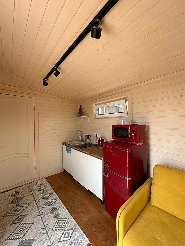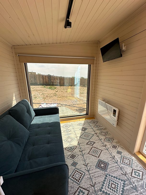 В этом доме удобный раскладной диван, который превращается в двуспальное место для ночлега. Также дом оборудован компактной кухней, телевизором, сплит-системой.