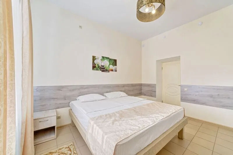 Одна двуспальная кровать (2 спальных места), собственная ванная комната, набор полотенец, средства личной гигиены, тапочки ,фен и чайник (по запросу на ресешене), кондиционер, набор постельного белья, натуральное постельное белье из 100% хлопка, стол и стулья, шкаф, прикроватные тумбочки, кондиционер, набор полотенец, телевизор. Бесплатный Wi-Fi. В стоимость номера входит завтрак.