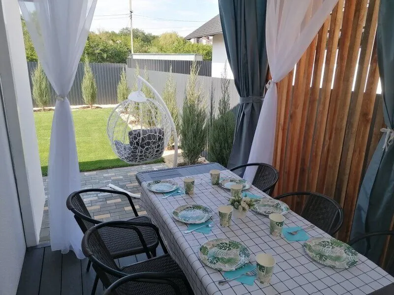 На территории для гостей имеется мангал, качели, кресло-кокон, шезлонги, настольный теннис. Дом оснащён необходимой бытовой техникой; в доме 2 спальни и кухня-гостиная с выходом на террасу.