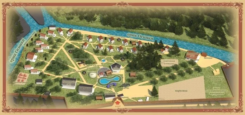 К услугам гостей приготовлены уютные дома со всеми условиями для комфортного проживания, банкетные залы, кафе, открытый бассейн с чистейшей водой, мангалы и барбекю, финская сауна с купелью, детская площадка, беседки, бильярдный зал, спортивные площадки и места для торжественных мероприятий, охраняемая автостоянка.