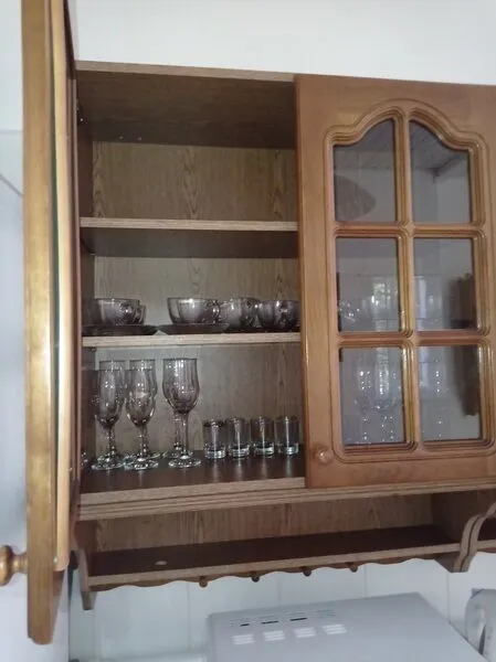 В кухне есть газовая плита, холодильник, СВЧ-печь, чайник и набор посуды.