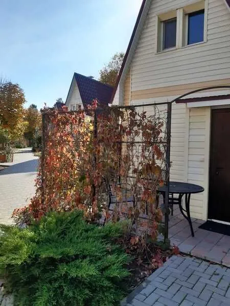 Около дома приватная зона с уютной террасой, мангальной зоной и качелями, территория огорожена живой изгородью с калиткой.