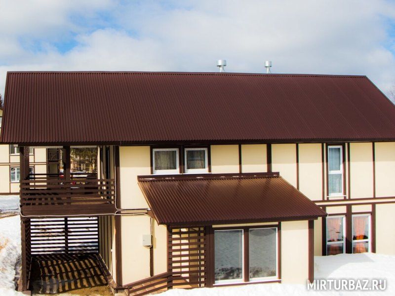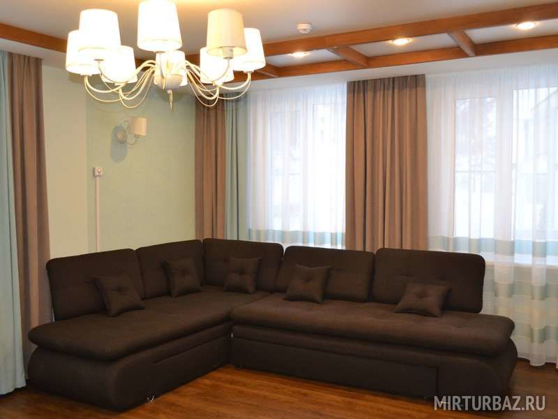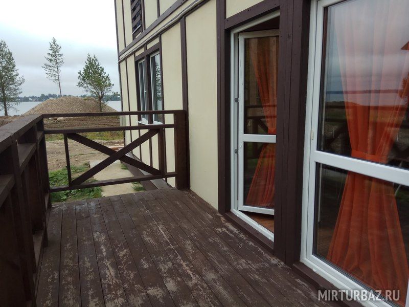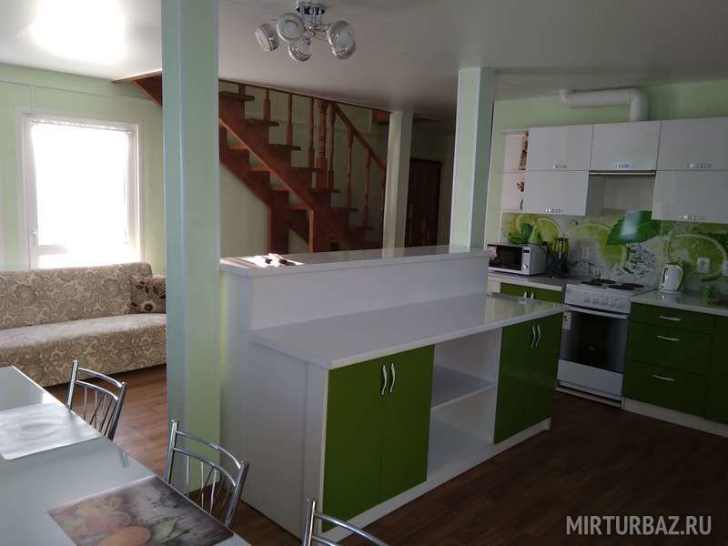 На первом этаже из гостиной есть выход на открытую террасу. Из одного номера на втором этаже можно выйти на общий большой балкон. Дом оснащен одним общим телевизором в гостиной, микроволновкой, холодильником с морозилкой, электрическим чайником, вытяжкой, электрической плитой с варочной поверхностью, наборами столовой и кухонной посуды, приборами на количество основных мест. Дом оснащен охранно–пожарной сигнализацией. Отопление электрическое.