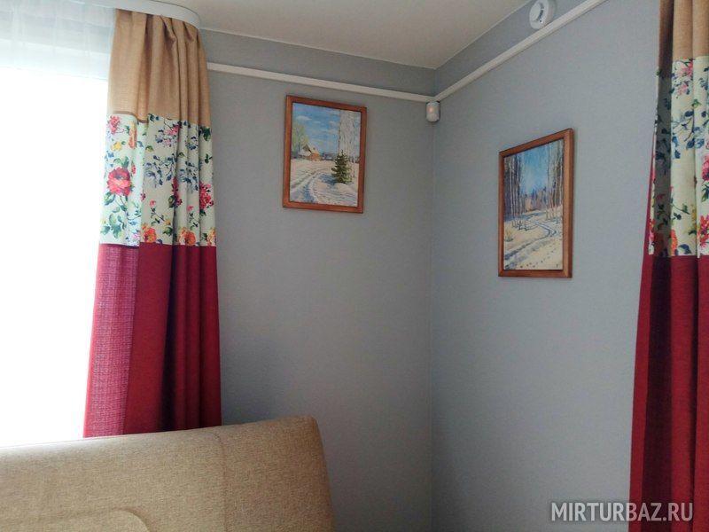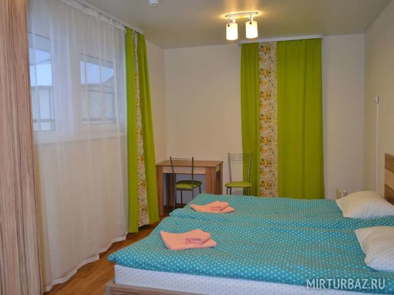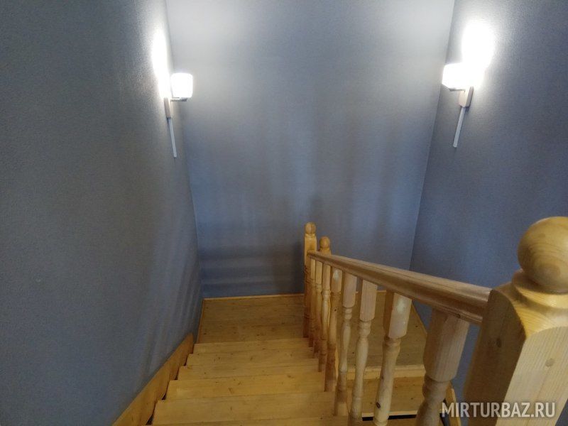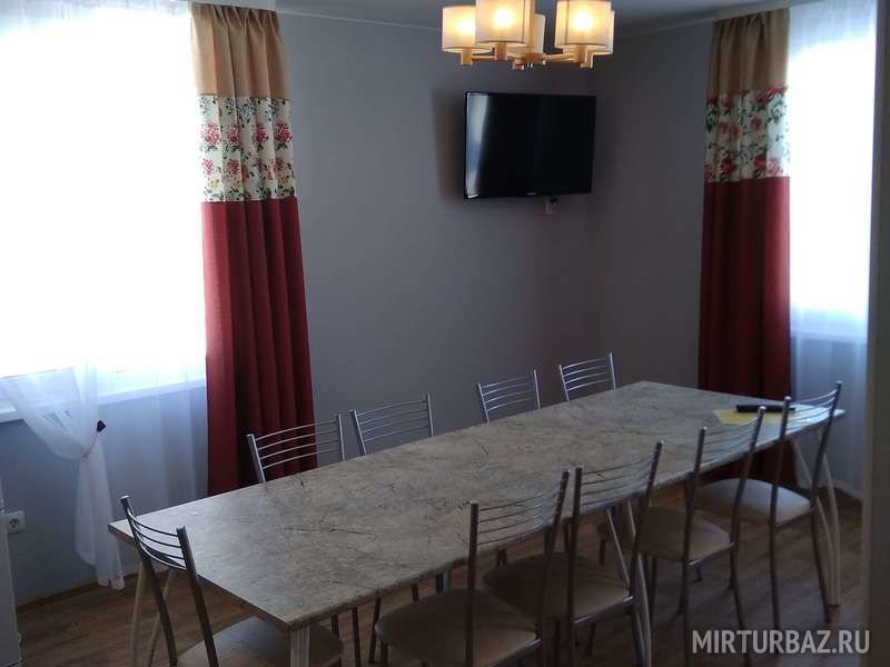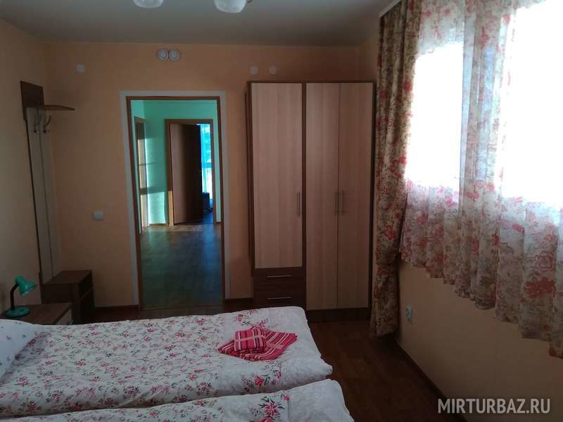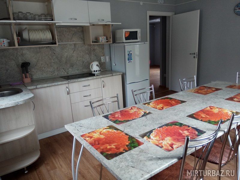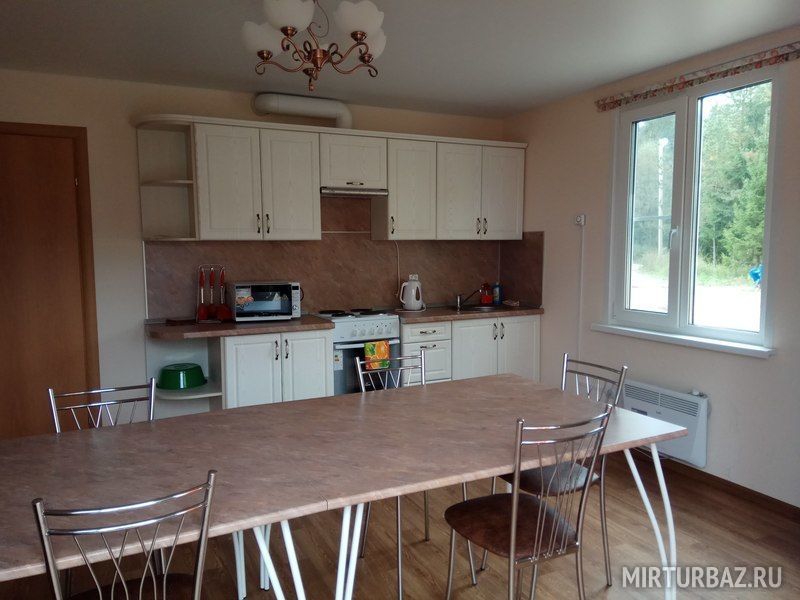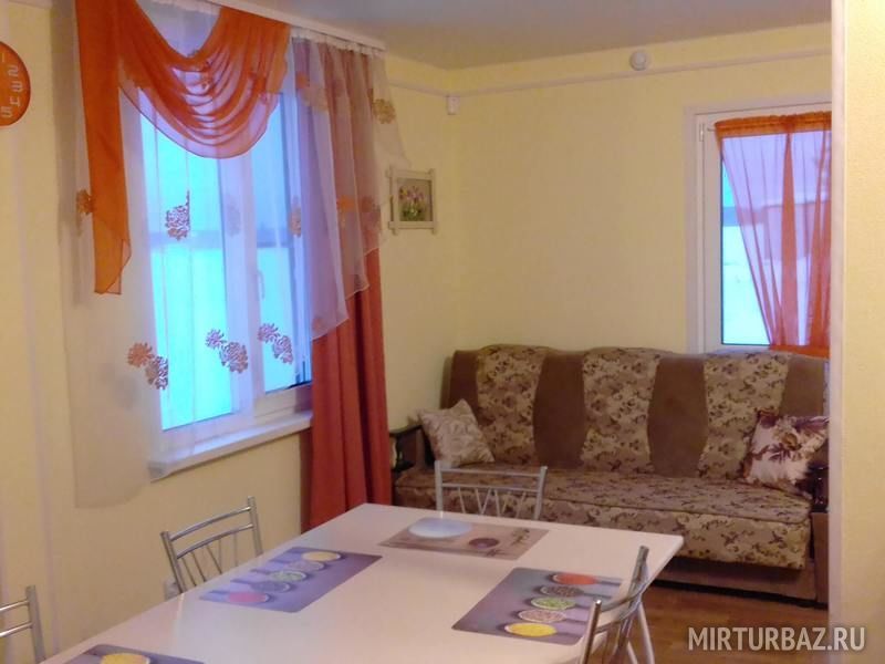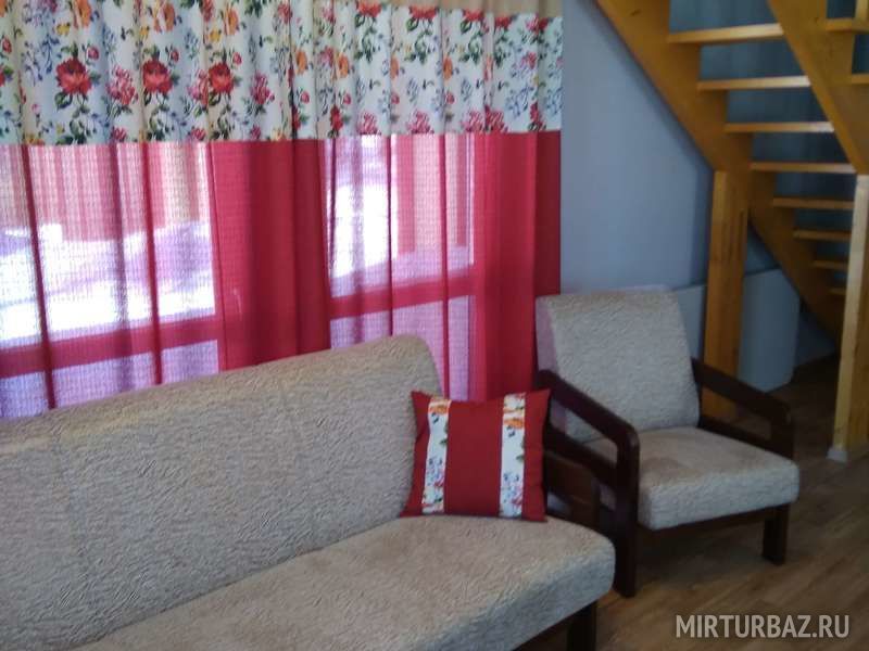 Из одного номера на втором этаже можно выйти на большой балкон. Дом оснащен одним общим телевизором в гостиной, микроволновкой, холодильником с морозилкой, электрическим чайником, вытяжкой, электрической плитой с варочной поверхностью, наборами столовой и кухонной посуды, приборами на количество основных мест. Дом оснащен охранно–пожарной сигнализацией. Отопление электрическое.