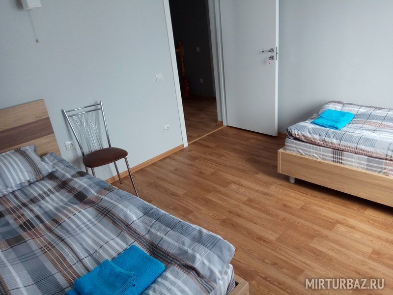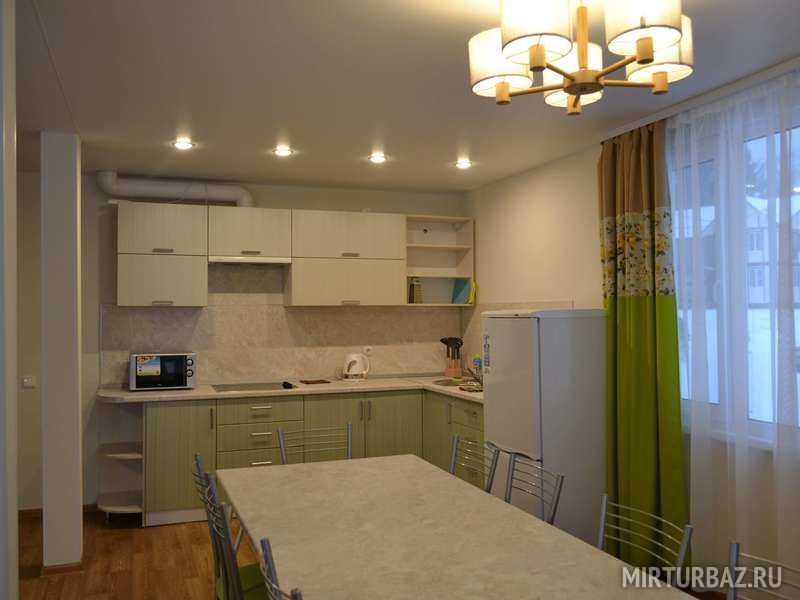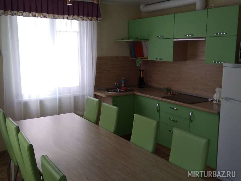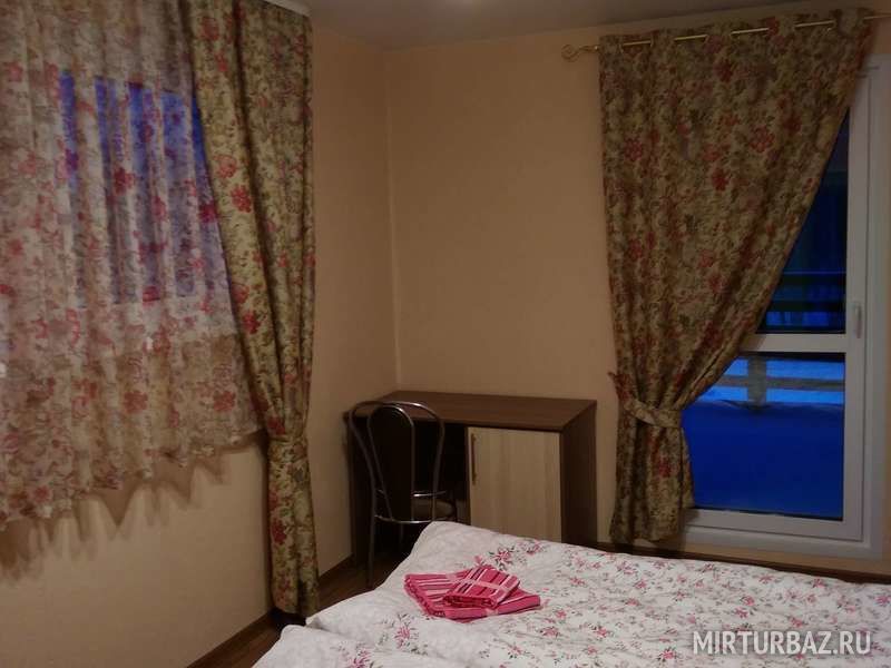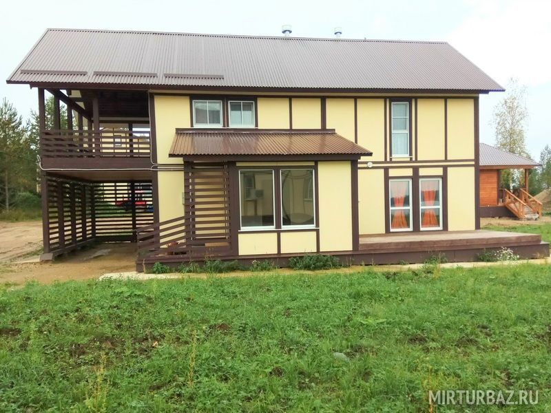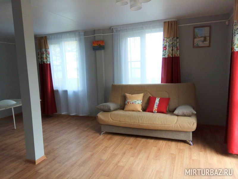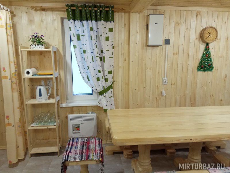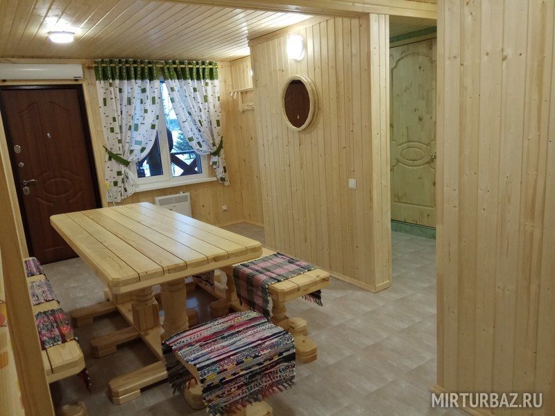 Из одного номера на втором этаже можно выйти на большой балкон. Дом оснащен одним общим телевизором в гостиной, микроволновкой, холодильником с морозилкой, электрическим чайником, вытяжкой, электрической плитой с варочной поверхностью, наборами столовой и кухонной посуды, приборами на количество основных мест. Дом оснащен охранно–пожарной сигнализацией. Отопление электрическое.
