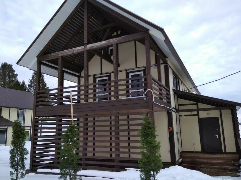 На первом этаже из гостиной есть выход на открытую террасу. Из двух номеров на втором этаже можно выйти на общий большой балкон. Дом оснащен одним общим телевизором в гостиной, микроволновкой, холодильником с морозилкой, электрическим чайником, вытяжкой, электрической плитой с варочной поверхностью, наборами столовой и кухонной посуды, приборами на количество основных мест. Дом оснащен охранно–пожарной сигнализацией. Отопление электрическое.