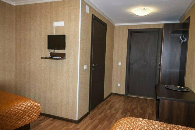 В стандартном номере одна 2х-спальная или 2-односпальных кровати (в зависимости от номера), сан.узел с душевой кабиной, прихожая, рабочий стол, ТВ.
