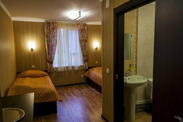 В комнате 2 односпальные кровати, санузел, спутниковое ТВ.