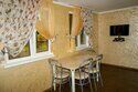 В просторной гостиной обеденная зона (стол, стулья), диван (раскладывается под спальное место), ТВ.
