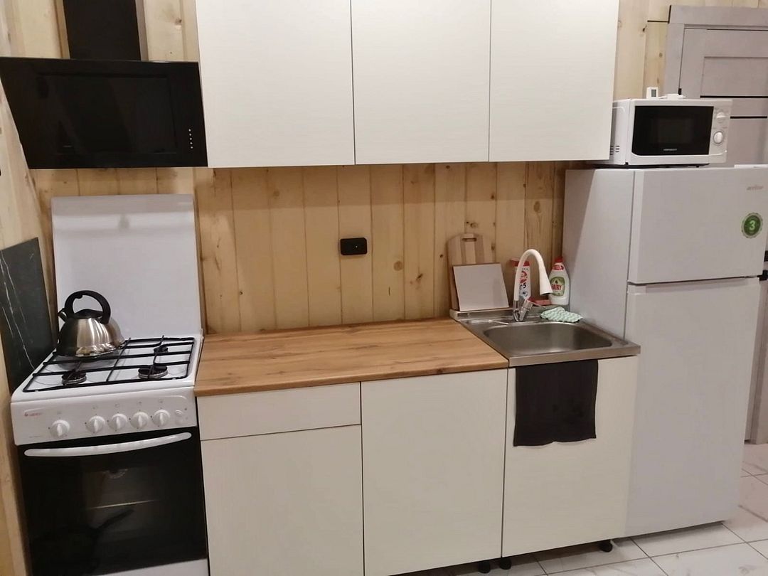 Просторная и уютная кухня-гостиная оснащена: большой угловой диван-кровать, кресло-кокон, обеденный стол со стульями, телевизор и Wi-Fi, музыкальная колонка, холодильник, микроволновая печь, электрическая плита, чайник и вся необходимая посуда для готовки и сервировки.