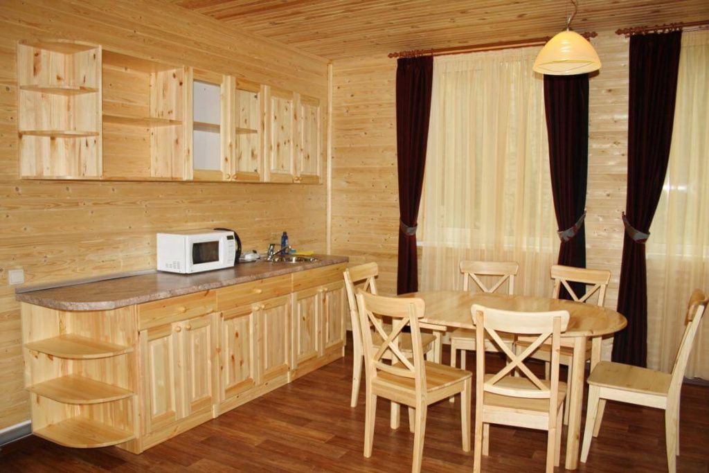 - Кухня (стол + 4 стула, кухонный гарнитур, электрочайник, микроволновая печь, холодильник, набор посуды);