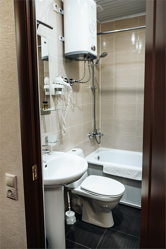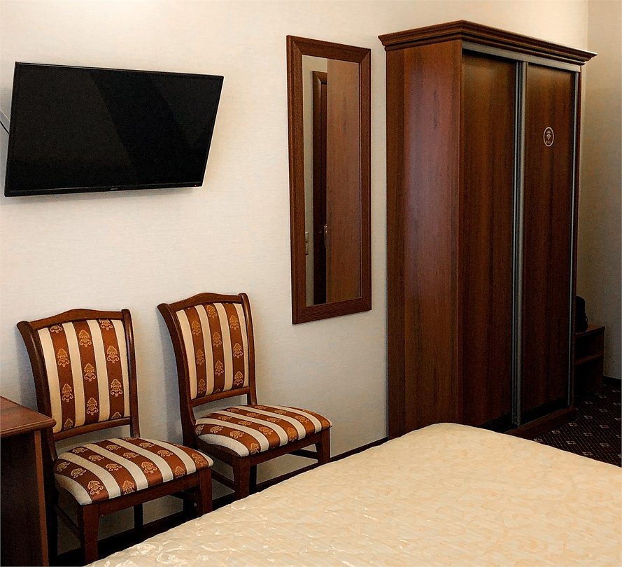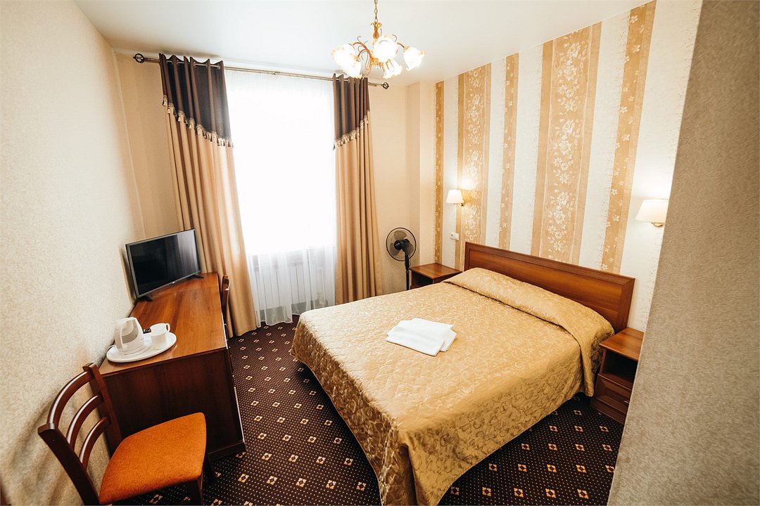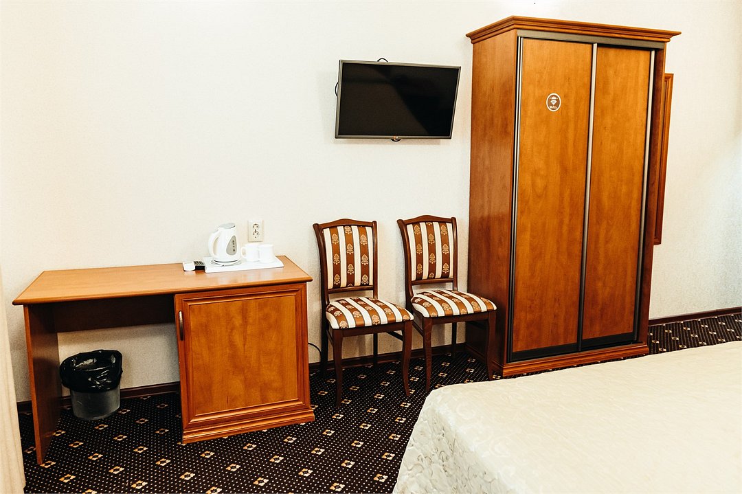телевизор, кабельное телевидение, Wi-Fi, холодильник, светильник, фен, ванна, водонагреватель, тапочки, двуспальная кровать, стулья, шкаф для одежды, вешалки, письменный стол, зеркало, чайник, унитаз, кулер на этаже, внутренний телефон, гостиничная парфюмерия, без питомцевВ гостиничном номере