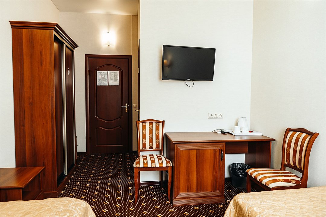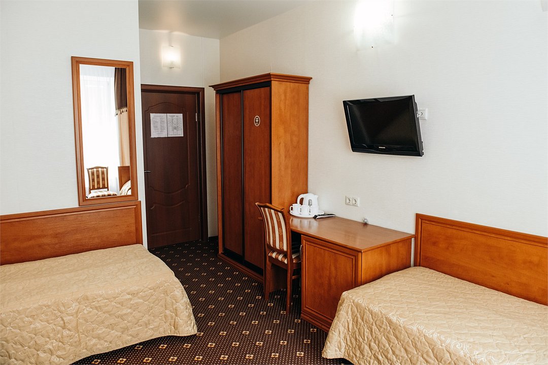 кабельное телевидение, Wi-Fi, холодильник, светильник, фен, ванна, водонагреватель, тапочки, две односпальные кровати, стулья, шкаф для одежды, вешалки, письменный стол, зеркало, чайник, унитаз, кулер на этаже, внутренний телефон, телевизор с плоским экраном, гостиничная парфюмерия, без питомцевВ гостиничном номере