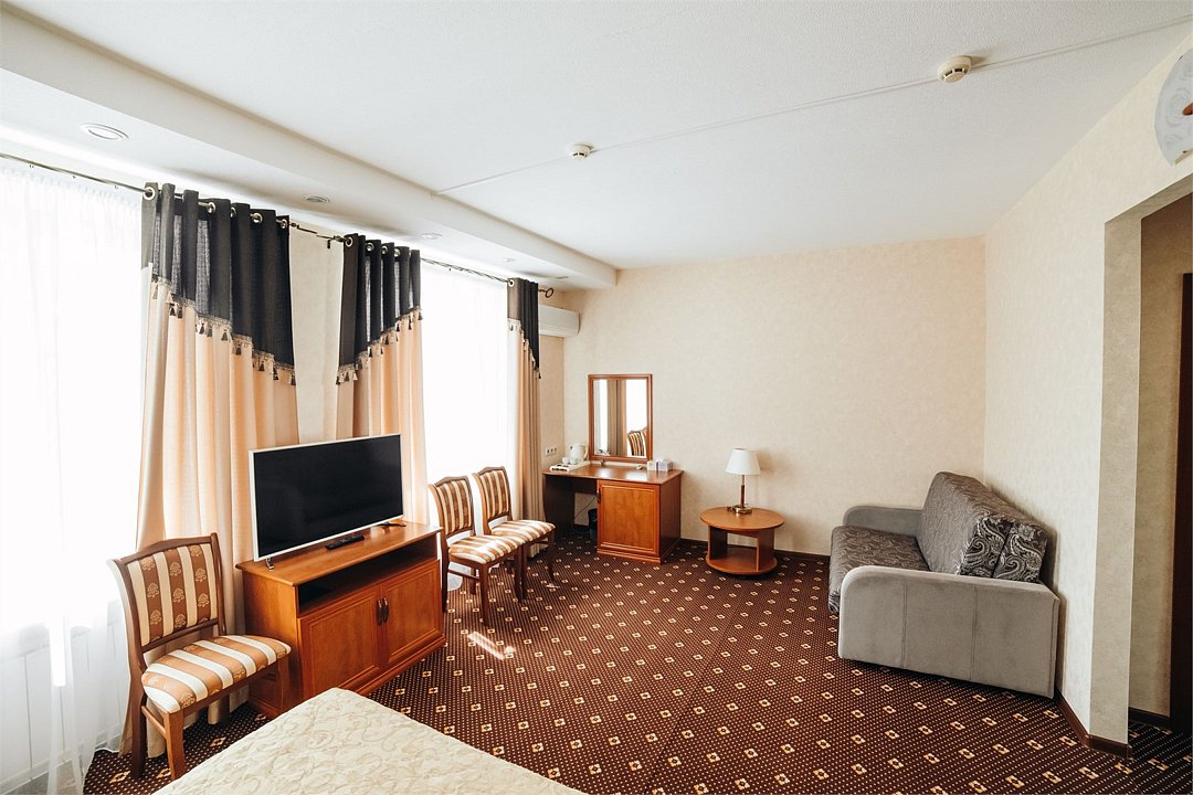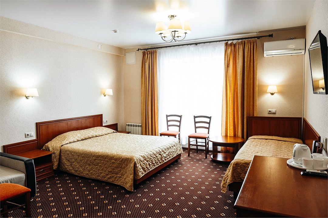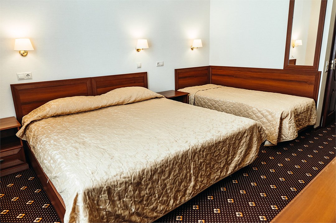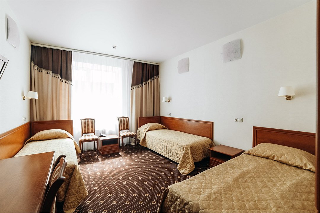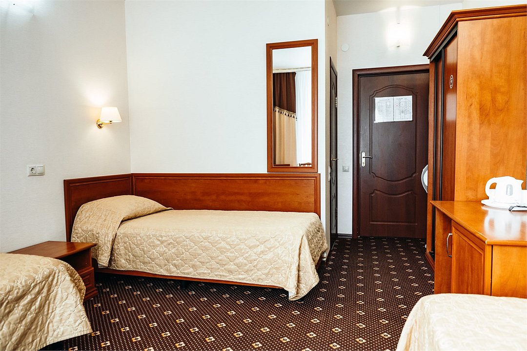 Комфортный однокомнатный номер с тремя односпальными кроватями, рассчитанный на проживание нескольких постояльцев. Номер пользуется большим спросом у командированных, а также групп школьников в дни школьных каникул.Услуги и удобства