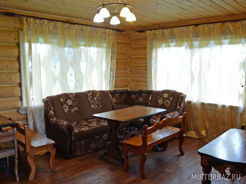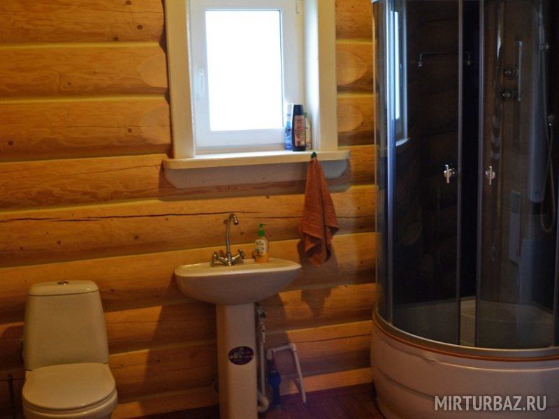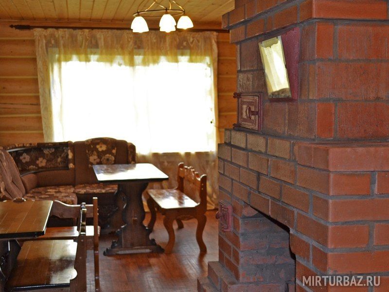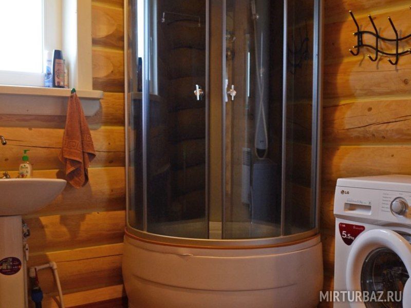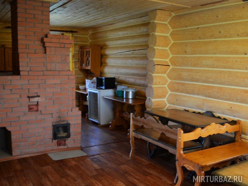 На первом этаже Гостевого дома расположена гостиная с большим угловым диваном, телевизором, русская печь, оборудованная кухня (есть холодильник, микроволновая печь, плита, электрический чайник, посуда), санузел с душевой кабиной, водонагревателем, стиральной машиной.
