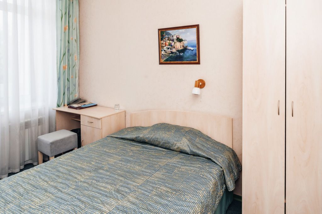 Номер первой категории. Однокомнатный номер с балконом общей площадью 12 м2. Полутораспальная кровать 120-140 см. Душевая кабина, туалет и ванная комната совмещенные. Комплектация: - холодильник - ТВ - беспроводной интернет - вода - ванные принадлежности, полотенца - фен - зубная щетка и паста, бритвенный набор за дополнительную платуУслуги и удобства