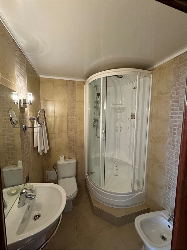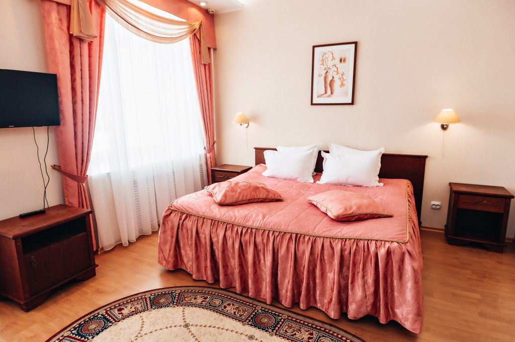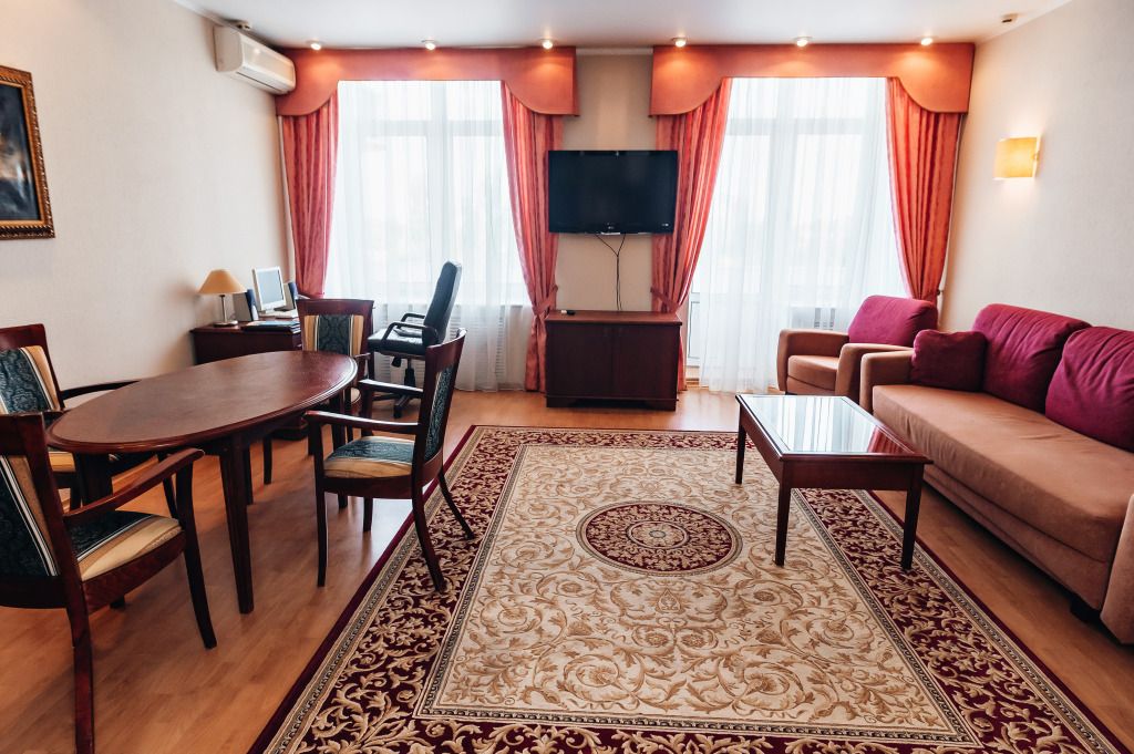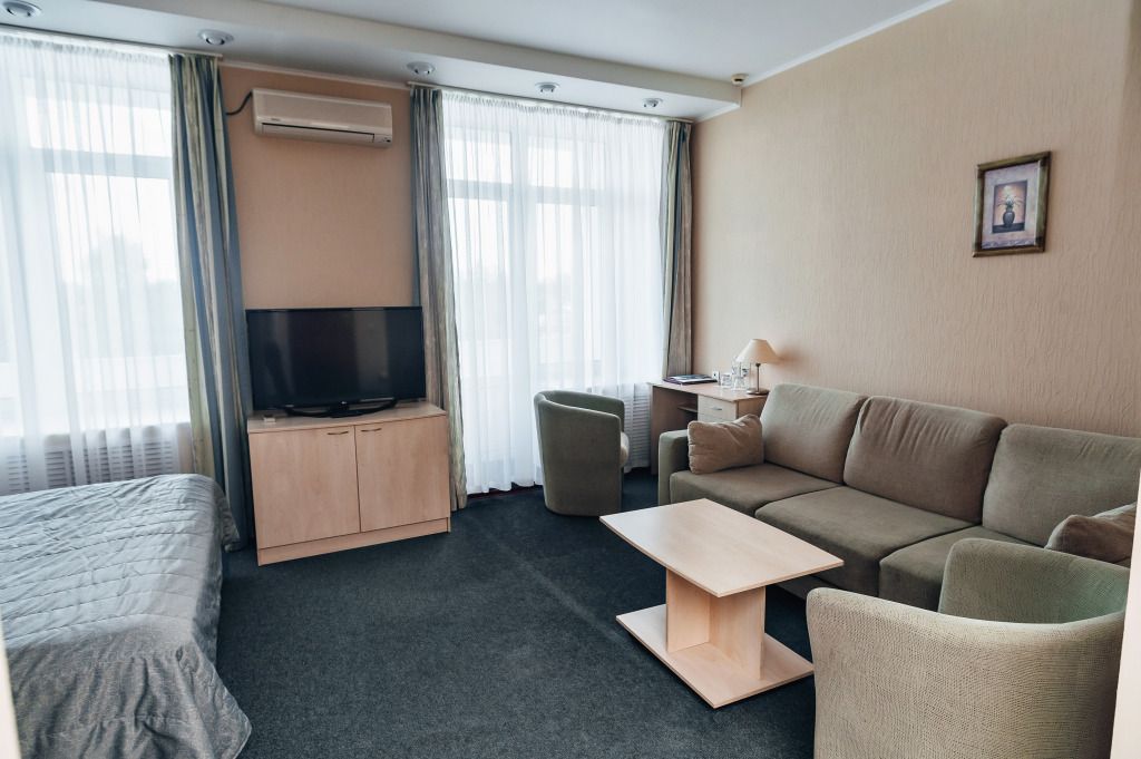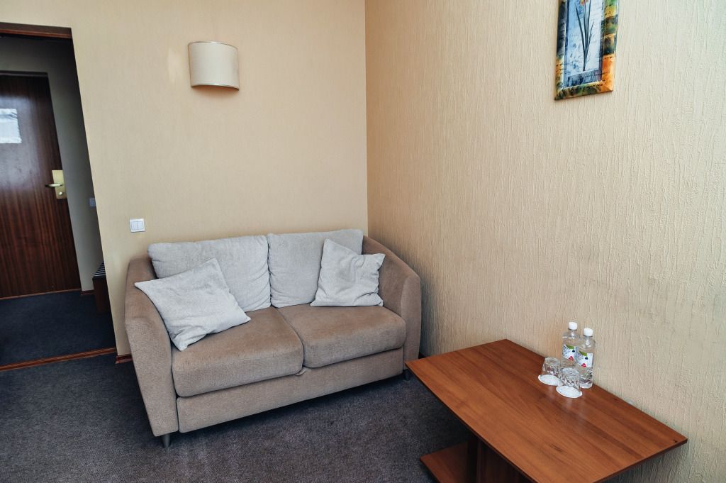 Номер первой категории. Двухкомнатный номер с балконом общей площадью 35 м2. Двуспальная кровать 180 см и полутораспальный диван в гостиной, который может быть использован в качестве дополнительного места. Размещение на дополнительном месте платное. Душевая кабина, туалет и ванная комната раздельные. Комплектация: - кондиционер - холодильник - ТВ - беспроводной интернет - вода - фен - ванные принадлежности, полотенца, тапочки, халаты - зубная щетка и паста, бритвенный набор за дополнительную платуУслуги и удобства