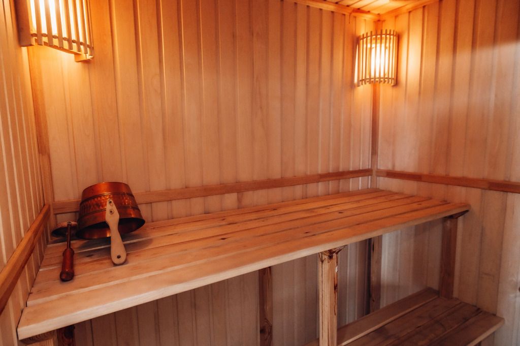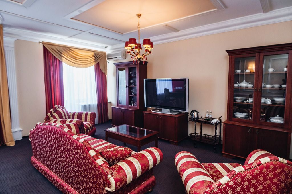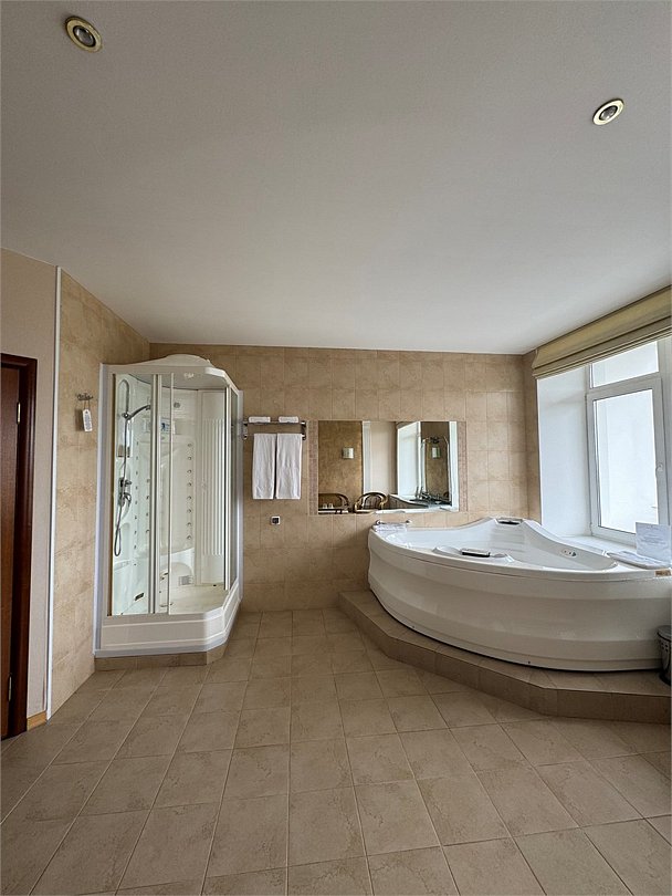 Номер категории "люкс". Двухкомнатный номер общей площадью 100 м2. Двуспальная кровать "super king size" 200 см и 2 дивана, которые могут быть использованы в качестве дополнительного места. Размещение на дополнительном месте платное. Гостиная, спальня, комната отдыха с сауной и джакузи. Два санузла с душевой кабиной. Комплектация: - кондиционер - холодильник - ТВ - беспроводной интернет - вода - ванные принадлежности, полотенца, тапочки, халаты, зубная щетка и пастаУслуги и удобства