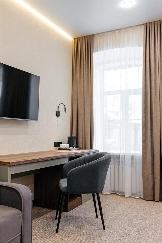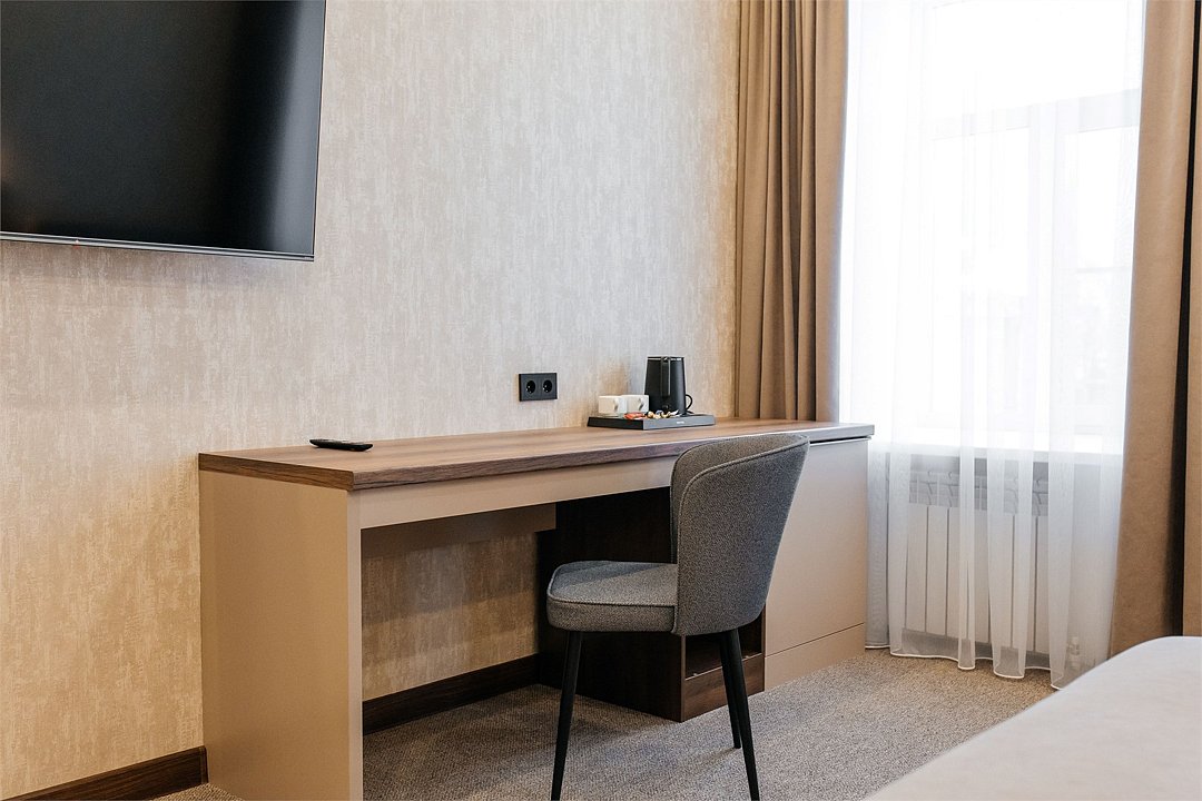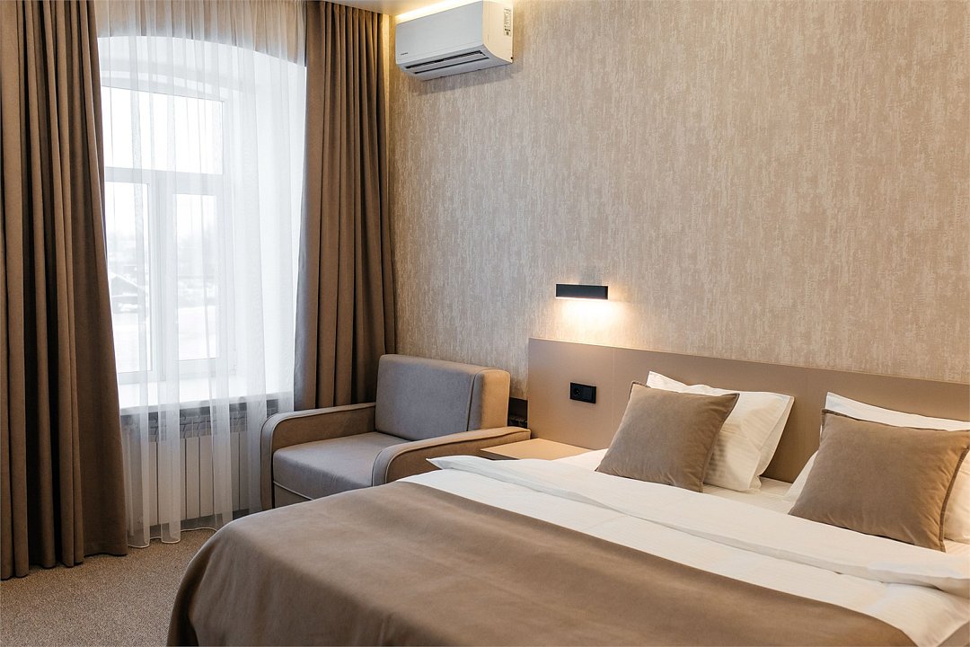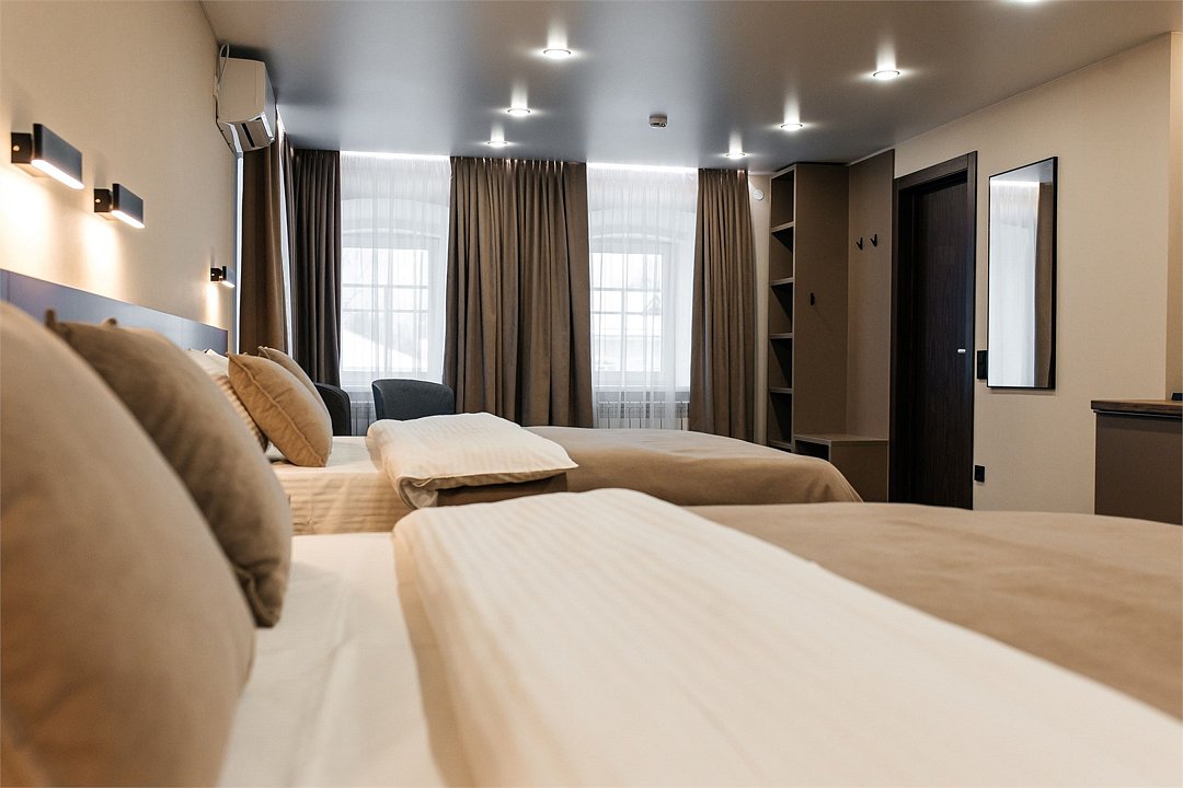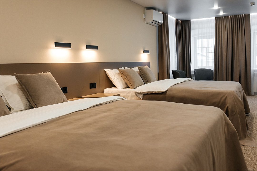 Современная удобная мебель и отличная звукоизоляция создает идеальные условия для отдыха в центре города. Площадь 25 кв.м. Расположен на 2 этаже. Номер с двумя двухспальной кроватью и креслом кроватью. В номере предусмотрена ванная комната, имеется фен, тапочки, косметические и туалетные принадлежности. В номере есть мини-холодильник, штопор, бокалы, чайные принадлежности, электрический чайник. В номере: ★ письменный стол со стулом; ★ шкаф; ★ зеркало; ★ телевизор с кабельным ТВ; ★ журнальный столик; ★ кондиционер; ★ бесплатный доступ к Wi-Fi; ★ туалетно-косметические принадлежности; ★ чайник с чайными принадлежностями. Количество комнат: 1 комн. Площадь номера: 25 кв.м. Вместимость: до 3х чел.Услуги и удобства