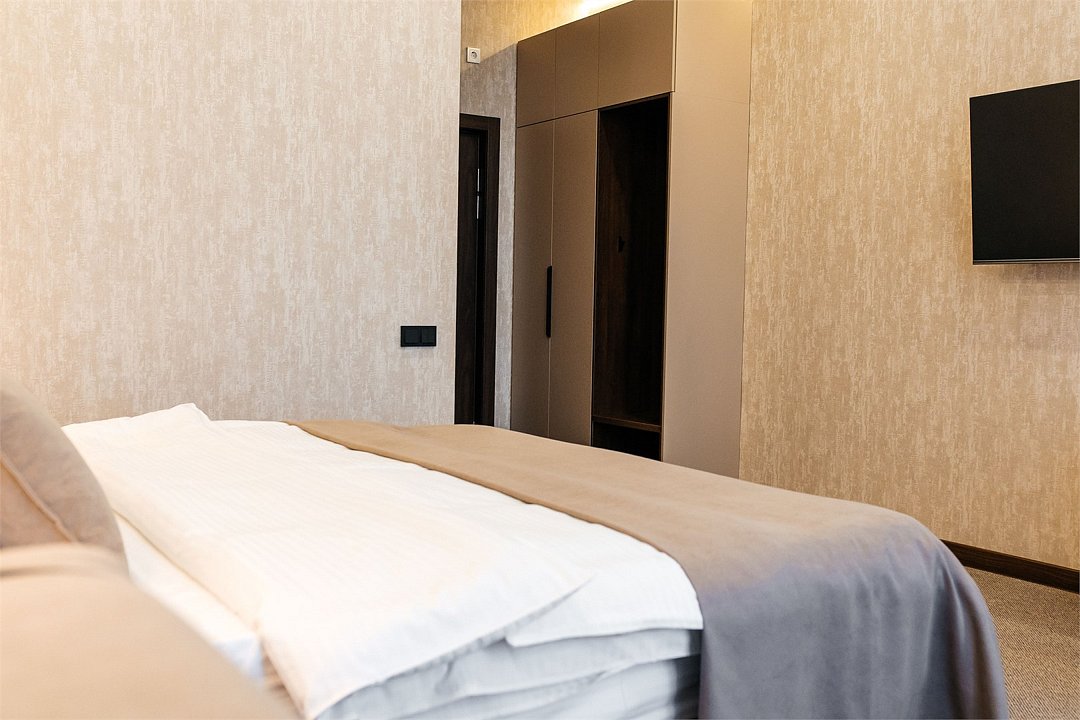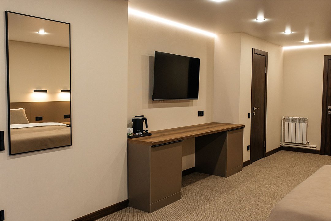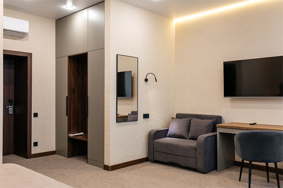 кондиционер, светильник, электронные замки, ванна, банные полотенца, две односпальные или большая двуспальная кровать, тумбы, шкаф для одежды, зеркало, унитаз, стул, стол, цифровое тв, раскладное кресло, мини-холодильник, телевизор со Smart TV, туалетные принадлежности премиум-класса, вешалки-плечикиВ гостиничном номере