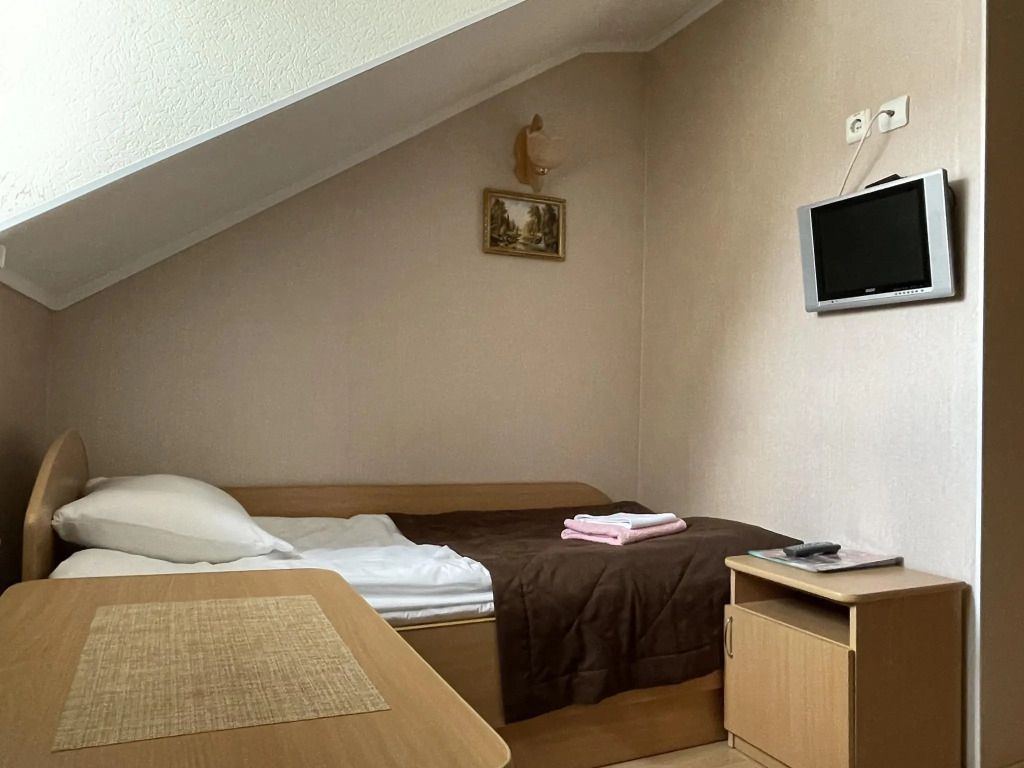 Гостиница рассчитана на 36 мест. 16 уютных, светлых одно -двух-трех-четырех местных номеров со всеми удобствами. Каждый номер оборудован телевизором, холодильником и ванной комнатой (душевая кабина, умывальник и туалет с современной сантехникой). Мансардные номера дополнительно оборудованы кондиционерами.