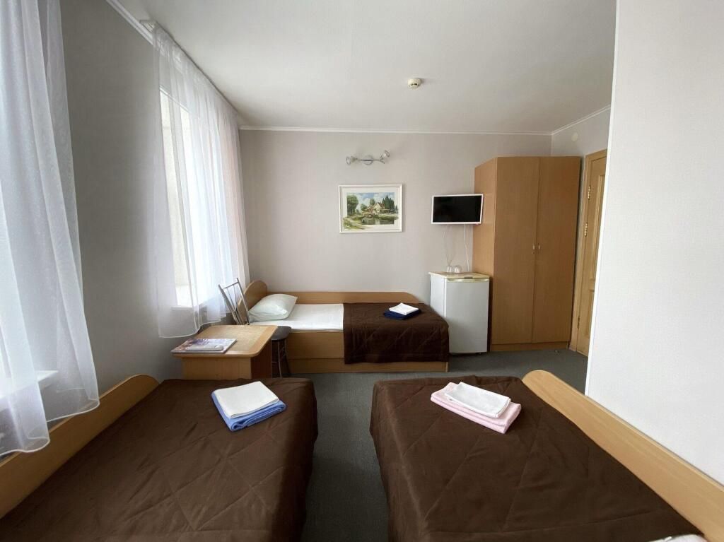 Номер меблирован тремя кроватями 0.9 м, тумба прикроватная, стул, стол журнальный, тумба под ТВ, шкаф.