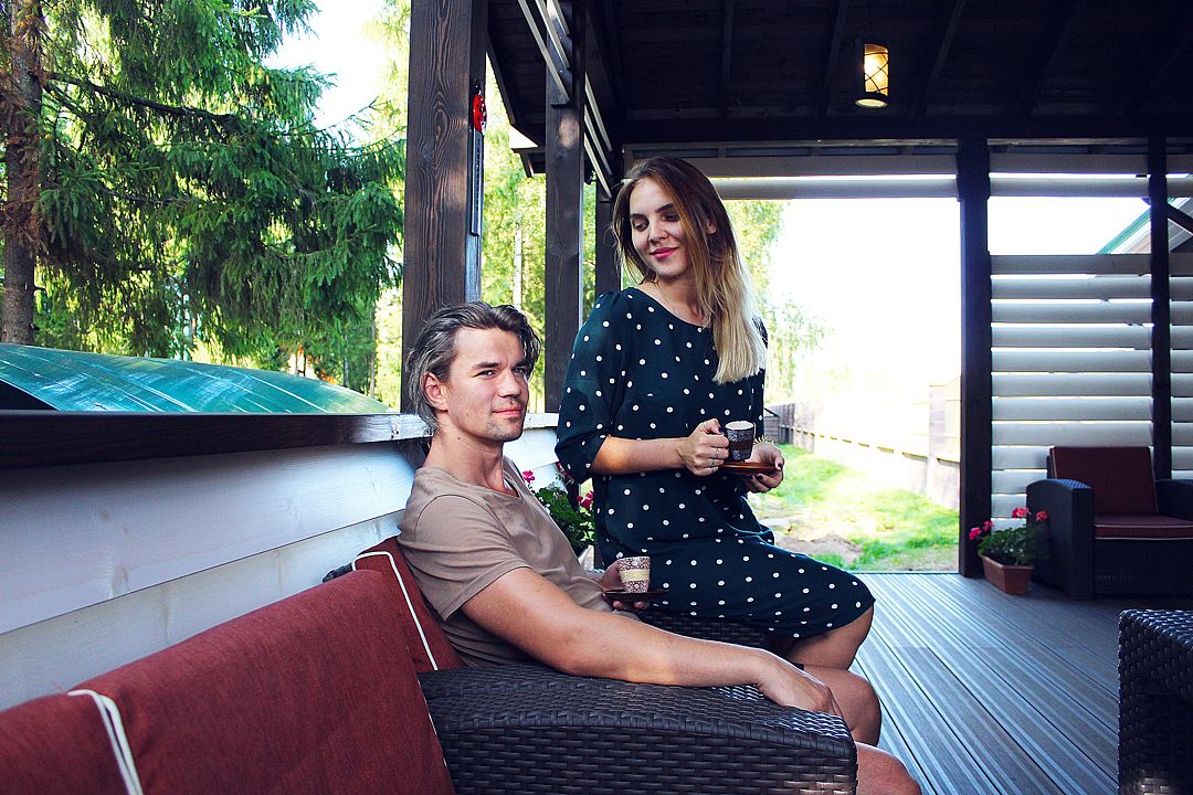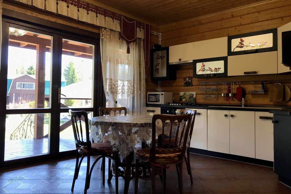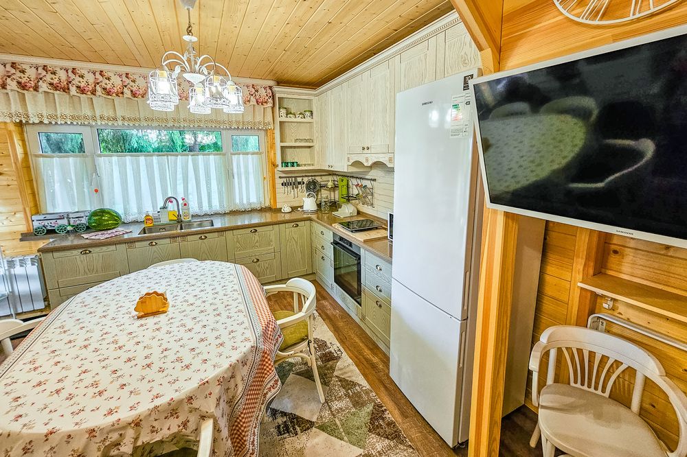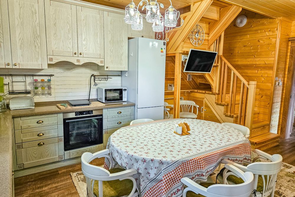 Благодаря большой кухне-гостиной с телевизором, музыкальным центром, а также открытой площадкой и крытой верандой, доступ к которым имеется напрямую из кухни, коттедж Берег идеально подходит для семейного отдыха, празднования юбилеев, отмечания дней рождений и свадебных торжеств.