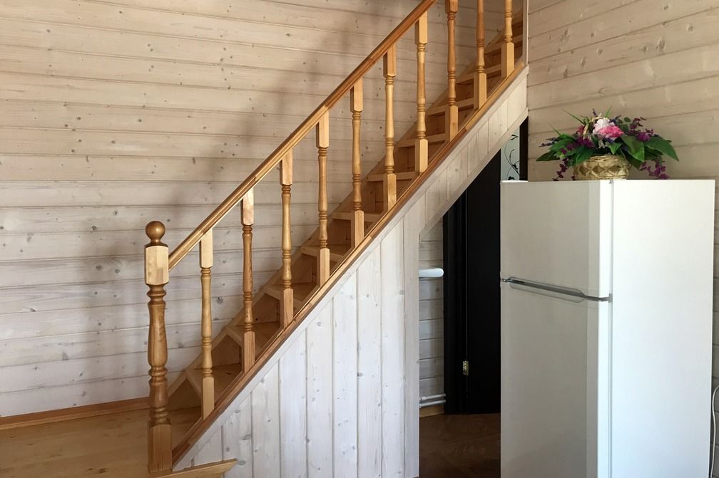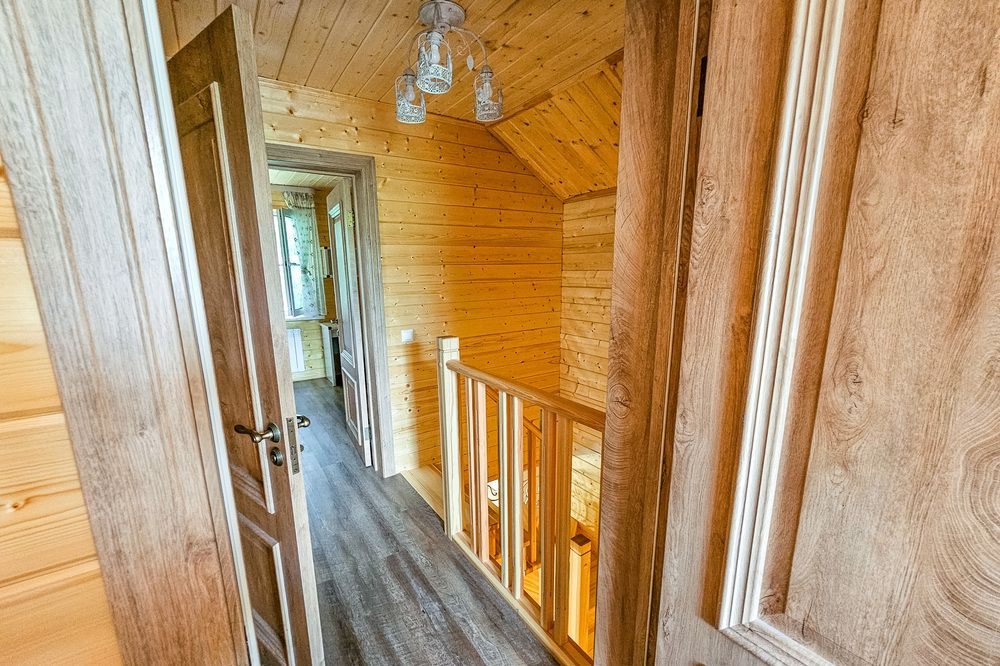 На втором этаже коттеджа расположены две отдельные спальные комнаты, из которых открывается великолепный вид на лес и берег реки Комела. На втором этаже находится второй санузел с душевой кабиной, раковиной и унитазом.