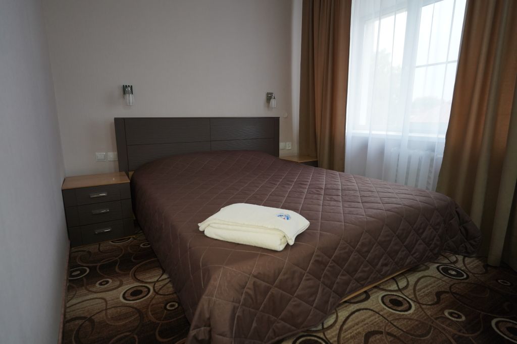 В комнате двухспальная кровать (шириной 140 см), телевизор, прикроватные тумбочки.